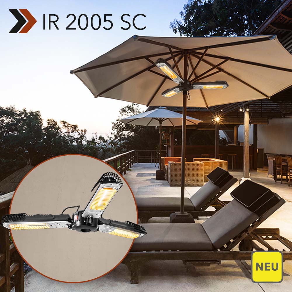 Mit dem neuen Infrarot-Heizstrahler IR 2005 SC erweitern Sie die Einsatzmöglichkeiten Ihres Sonnenschirms auch an kühlen Tagen. Denn der pfiffig konstruierte 3-Flügel-Heizstrahler wurde speziell für die unkomplizierte Befestigung unter nahezu jedem Sonnen- oder Gastroschirm entwickelt. So lassen sich Sitzgruppen im Garten, Tische in der Außengastronomie oder Stehtische auf Outdoor-Events und -Messen mit angenehmer Rundumwärme versorgen – ohne dabei zusätzlich Platz in Anspruch zu nehmen. Und selbstverständlich überzeugt das durchdachte Design des neuen Schirm-Heizstrahlers auch hinsichtlich Ästhetik, Funktionalität und Sicherheit.