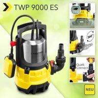 Die Tauchpumpe TWP 9000 ES erhalten Sie als Komplett-Set mit Reduzieradapter, einem 360° Winkeladapter, Schnell-Anschluss für Winkeladapter sowie einem 10 m langen Nylonseil zum Herablassen der Pumpe und 10 m langem Netzkabel.