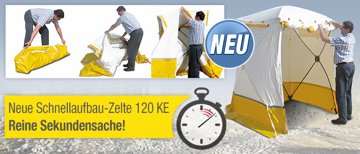 Sparen Sie wertvolle Arbeitszeit durch sekundenschnellen Aufbau – informieren Sie sich am besten direkt hier über die Arbeitszelte 120 KE.