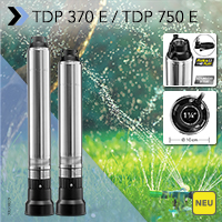Ein jeweils 23 Meter langes Unterwasserkabel versorgt die äußerst kompakten Pumpen zuverlässig mit elektrischem Strom und diese sind somit durch Plug & Play zur sofortigen Nutzung installiert. Darüber hinaus verfügen die Pumpengehäuse der TDP 370 E und TDP 750 E an der Kopfseite über zwei Aufhängeösen zum bequemen Herablassen in das zu fördernde Wasser. Der optional zu befestigende Distanzfuß ermöglicht den Einlass der Tiefbrunnenpumpen bis auf den Grund der vorgebohrten Vertiefung wie etwa Drainage-Schacht oder Brunnen.