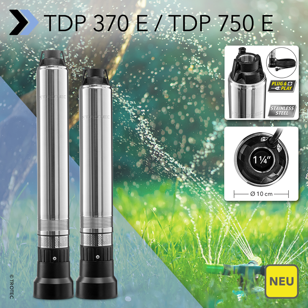Nutzen Sie doch das kostenlose Brauchwasser auf Ihrem Grundstück zur Bewässerung von Grünanlagen und Gartenbereichen sowie zur Versorgung wasserintensiver Verbrauchsstellen im Haus. So sparen Sie Jahr für Jahr viele Kubikmeter teuren Leitungswassers und auf Dauer kommt da ein erkleckliches Sümmchen zusammen. Die zuverlässigen Tiefbrunnenpumpen, die Sie dazu benötigen, erhalten Sie bei Trotec: speziell konzipierte und höchst effiziente Tauchdruckpumpen, die wegen ihrer besonderen Bauweise und hochwertigen Technik in sehr engen Bohrbrunnen, ab einem Durchmesser von 12,5 Zentimetern, eingesetzt werden können – wählen Sie je nach Anforderung zwischen der leistungsstarken TDP 370 E und der kraftvollen TDP 750 E.
