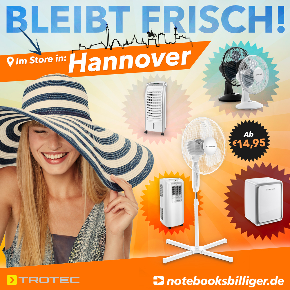 Unsere Marken-Geräte erhalten Sie im Hannoveraner Ladengeschäft von notebooksbilliger.de zu denselben Topp-Preisen wie im Trotec Online-Shop: Leistungsstarke Klimageräte und Luftkühler, die ruckzuck Ihre Räume auf Wohlfühl-Temperaturen herunterkühlen, Ventilatoren in verschiedenen Designs, die mittels des von ihnen erzeugten Luftstroms die gestaute Hitze in Wohn- und Büroräumen zum offenen Fenster hinausblasen. Luftentfeuchter, die in Ihren vier Wänden für das ideale Raumklima sorgen. Von jetzt an können alle Hannoveraner, die unsere Topp-Angebote wahrnehmen, lästiges Schwitzen in schwülen Räumen einfach vergessen!