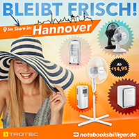 Aufgepasst, lieber Hannoveraner: Die Hitze kommt! Für alle, die dabei nicht ins Schwitzen kommen möchten, gibt’s jetzt die Trotec Anti-Hitze-Produkte wie mobile Klimageräte und Luftkühler, Ventilatoren sowie Luftentfeuchter zu unschlagbar günstigen Preisen direkt zum Mitnehmen vor Ort: im Store von notebooksbilliger.de in Hannover. Ohne Zeit zu verlieren quasi direkt von der Schwüle in die große Kühle: zu Hause oder im Büro aufstellen, einstecken, fertig! Und sofort genießen Sie Entspannung pur!