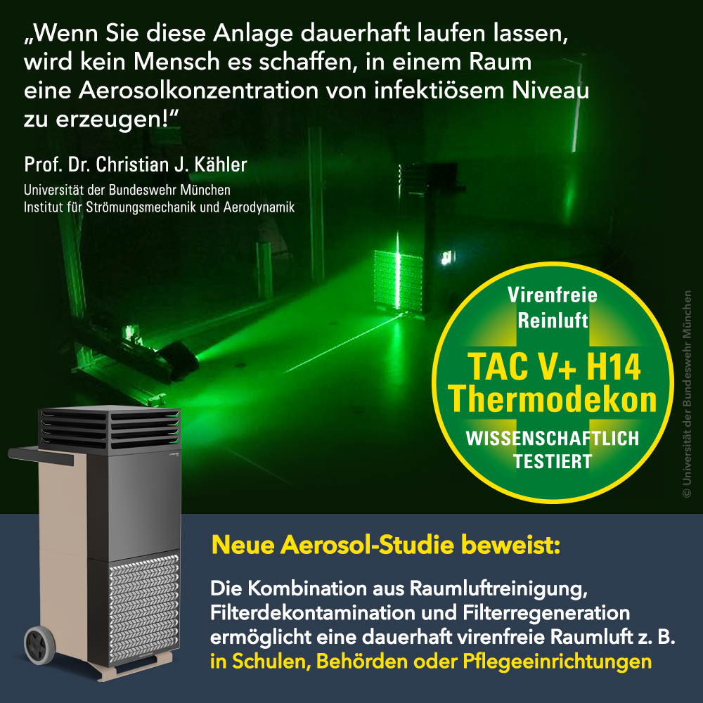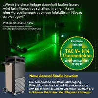 In einem Interview mit dem Redaktionsnetzwerk Deutschland (RND) hebt Kähler daher diese thermische Selbstreinigungsfunktion des mobilen Luftreinigers TAC V+ explizit hervor, die weltweit einzigartig ist und einen entscheidenden Vorteil gegenüber stationären Lüftungsanlagen hat. Denn im Gegensatz zu herkömmlichen Lüftungs- und Filteranlagen, die ohne regelmäßige Dekontamination und Reinigung schnell zu Keimschleudern werden können, weil sich Feuchtigkeit, Viren und Bakterien in den Geräten und Luftkanälen ansammeln, wird der hitzebeständige H14-Virenfilter nach EN 1822 (ISO 45H Filter ISO 29463) des Gerätes regelmäßig auf 100 °C aufgeheizt, um die abgeschiedenen Viren mittels thermischer Dekontamination zuverlässig abzutöten.