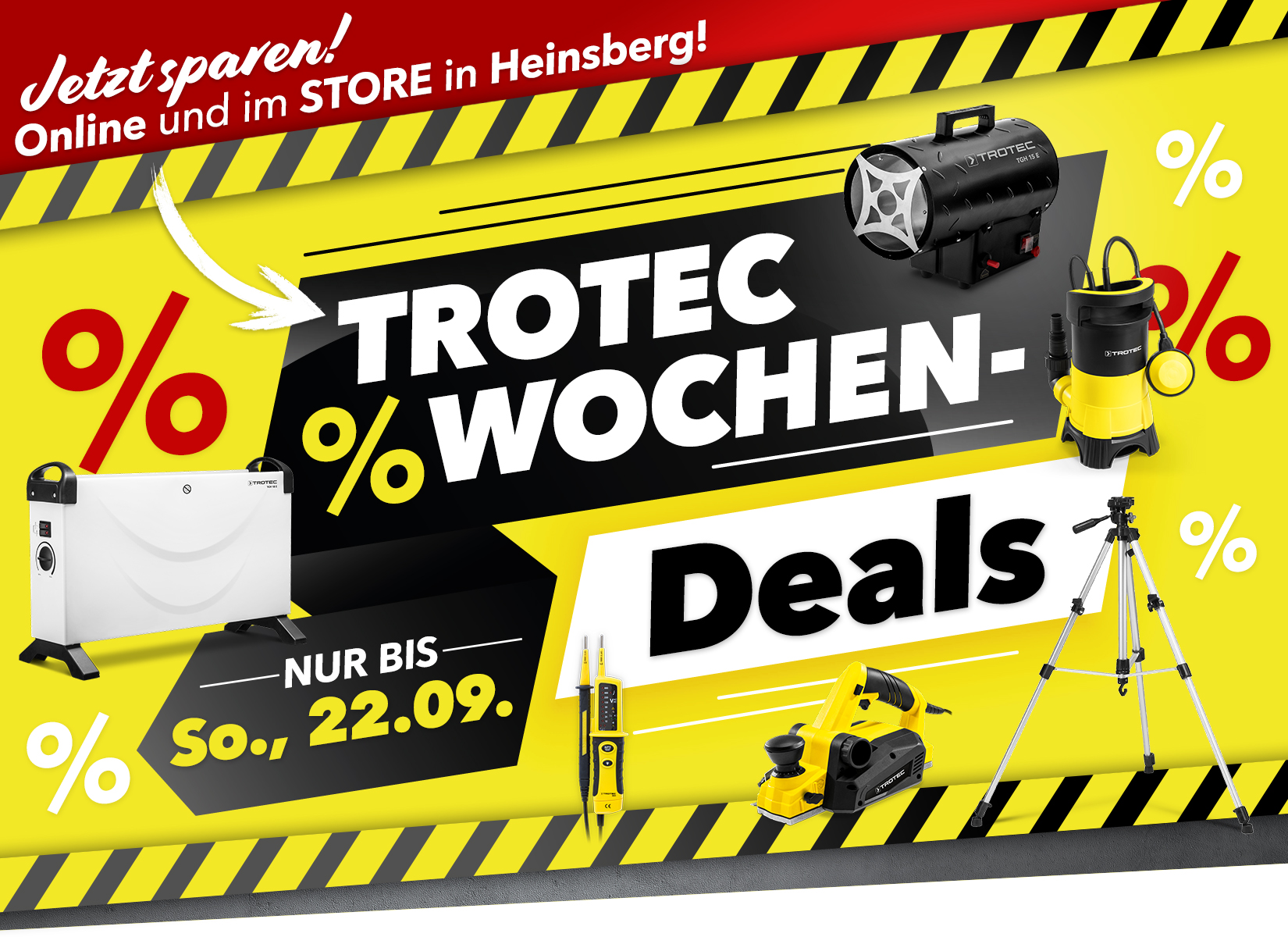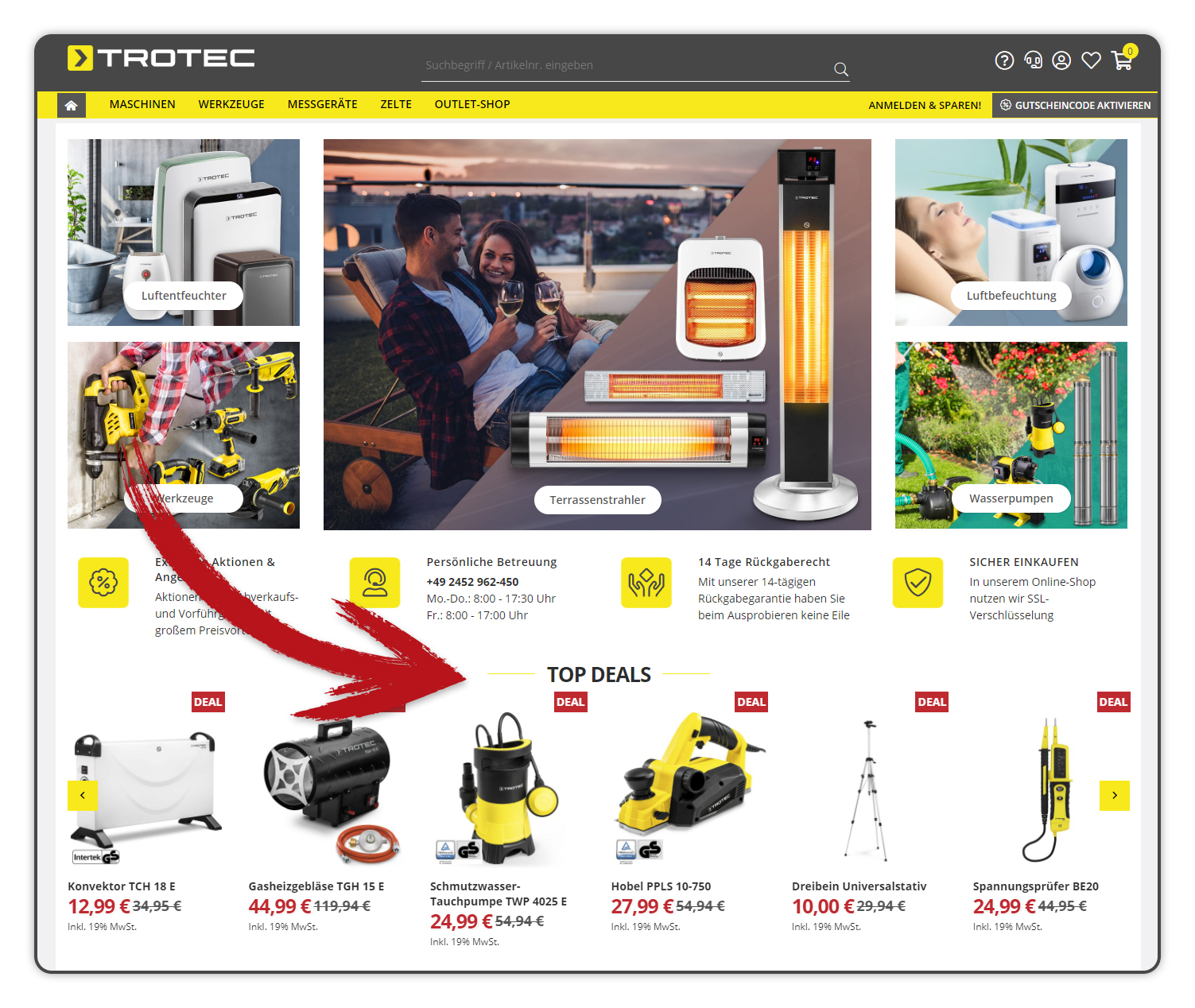 Auf unserer Startseite im Online-Shop de.trotec.com/shop werden Ihnen alle „TOP DEALS“ angezeigt. Navigieren Sie einfach mit den Pfeilen nach „rechts“ und „links“ und Sie finden alle aktuellen Deals.