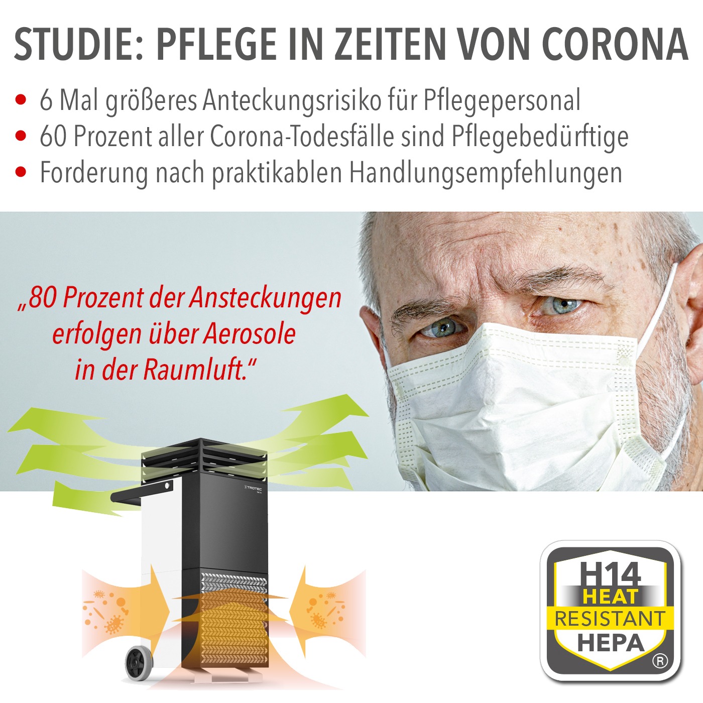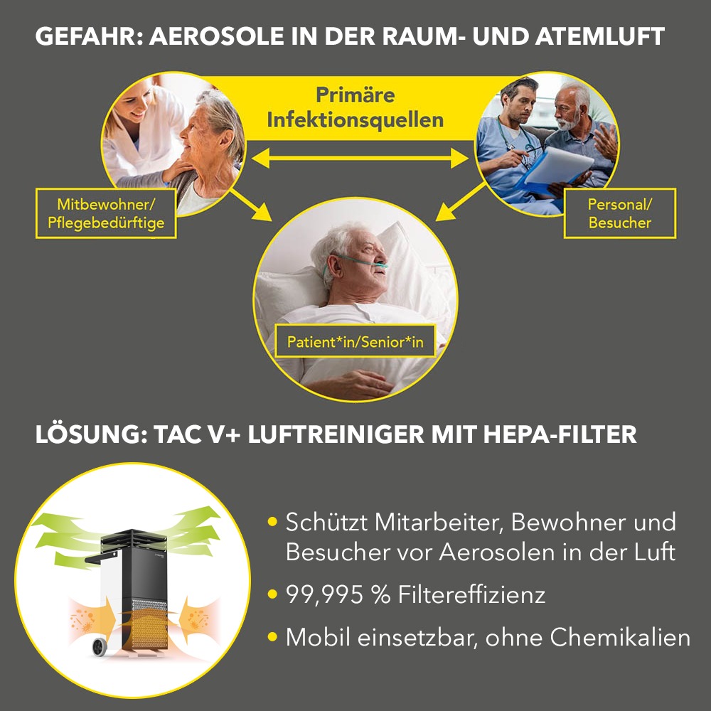 Abstandsregeln alleine reichen nicht aus, um Menschen in Senioren- und Pflegeheimen vor einer Infektion mit dem Coronavirus zu schützen. Der Hauptübertragungsweg des Coronavirus sind sogenannte Aerosolteilchen, winzig kleine (ca. 0,3-0,4 μm), aber mitunter infektiöse Partikel, die beim Atmen und Sprechen in den Raum abgegeben werden. Im Gegensatz zu den größeren Tröpfchen, die aufgrund ihres Gewichts bereits nach wenigen Metern zu Boden sinken (daher die Abstandsregel von 1,5 m), schweben die virenbehafteten Krankmacher mehrere Stunden in der Luft – und werden eingeatmet.