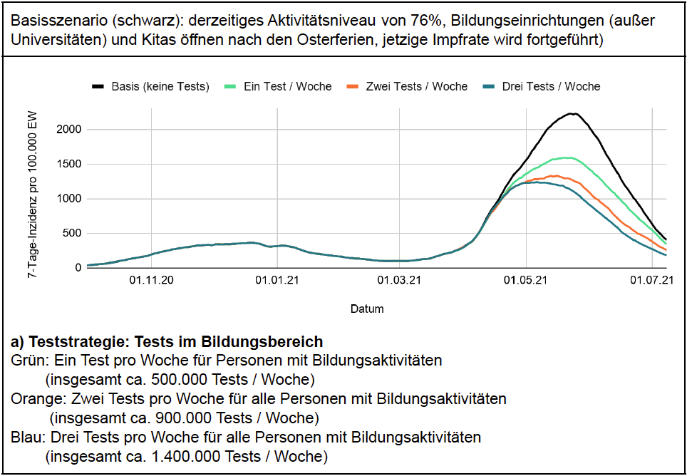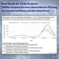 Sie kommen zum Ergebnis: Würden die Kitas und Schulen nach den Osterferien ohne zusätzliche Maßnahmen wieder geöffnet, so wäre bereits im Mai mit einer Sieben-Tage-Inzidenz von etwa 2000 zu rechnen.