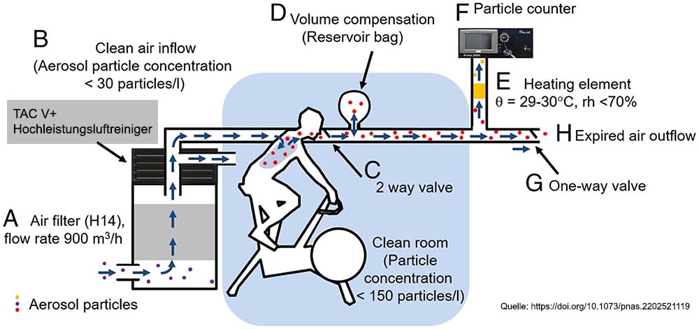 In ihrem Versuchsaufbau wurden zunächst bereits vorhandene Aerosole mit einem TAC V+ Hochleistungsluftreiniger aus der Umgebungsluft herausgefiltert. So gereinigt, wurde diese Luft über eine spezielle Mund-Nasen-Maske von den Probanden und Probandinnen während des folgenden Belastungstests auf dem Ergometer eingeatmet. Die Intensität der Belastung wurde hierbei stufenweise gesteigert, von der Ruhe bis zur körperlichen Erschöpfung. Die Maske war an ein sogenanntes Zwei-Wege-Ventil angeschlossen, wodurch nur die tatsächlich ausgeatmete Luft ausströmen kann. Die pro Minute emittierten Aerosolpartikel wurden anschließend gemessen und konnten unmittelbar mit der aktuellen Leistung der gesunden Probanden und Probandinnen im Alter von 18 bis 40 Jahren abgeglichen werden.