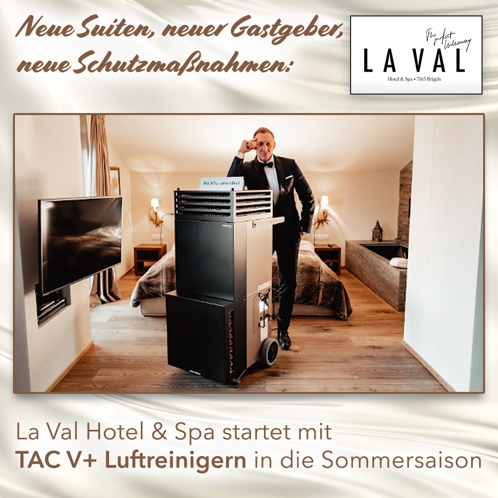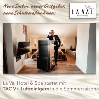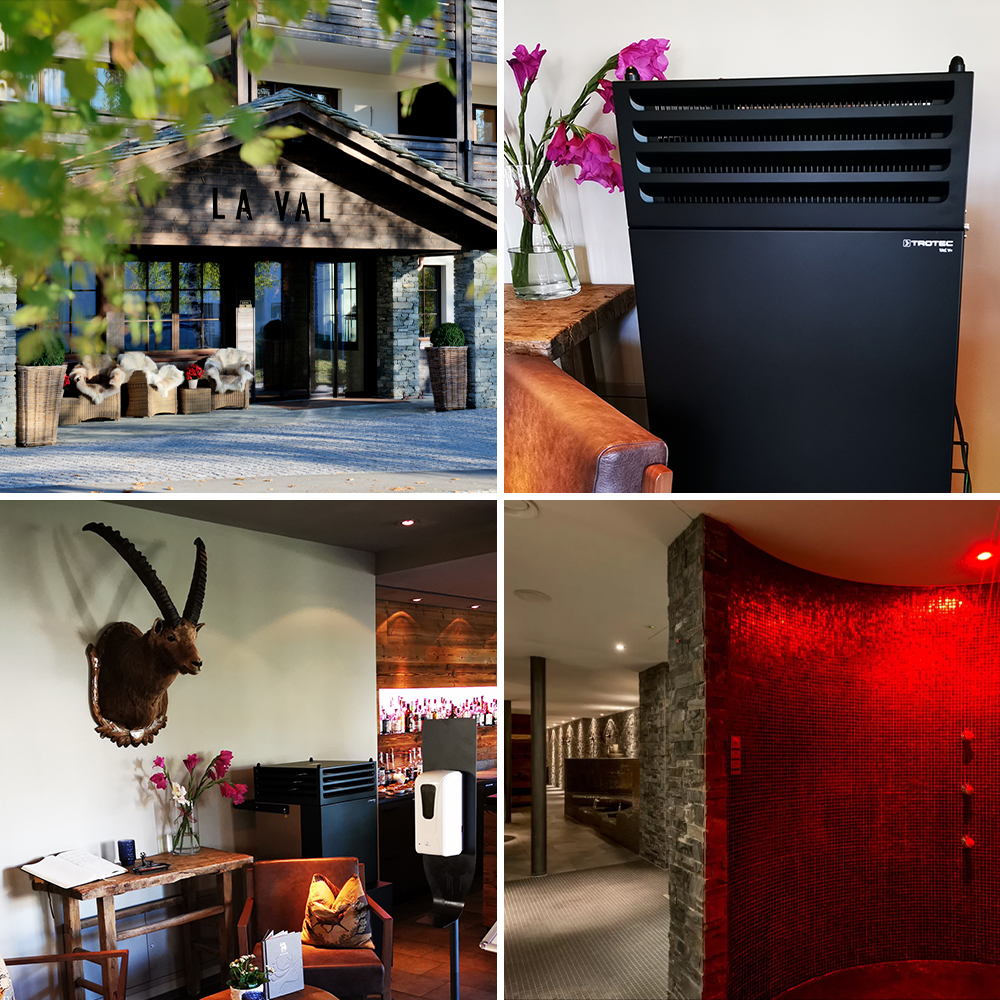 Die Gesundheit der Gäste hat im La Val Hotel oberste Priorität. Als eines der ersten Hotels in der Schweiz wurden alle Bereiche mit Trotec-Hochleistungsluftreinigern ausgestattet, um die Umgebungsluft zu 99,995 % von infektiösen Viren sowie weiteren Krankheitserregen zu befreien. „Ein Topmodell, das auch Mutationen von Covid-19 aus der Luft filtert.“, erläutert das Hotel zu Recht in seinen Informationen zum hauseigenen Hygienekonzept und weiter: „Vielleicht ist unsere Covid19-Prävention etwas übertrieben, aber unser Motto fürs 2021 lautet: Sicher ist sicher! – In diesem Sinne bietet Ihnen das La Val Hotel & Spa die optimale Sicherheit.“