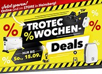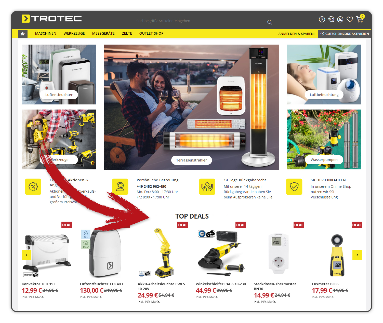 SO FINDEN SIE IHRE DEALS IM ONLINE-SHOP:Auf unserer Startseite im Online-Shop de.trotec.com/shop werden Ihnen alle „TOP DEALS“ angezeigt. Navigieren Sie einfach mit den Pfeilen nach „rechts“ und „links“ und Sie finden alle aktuellen Deals. |