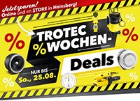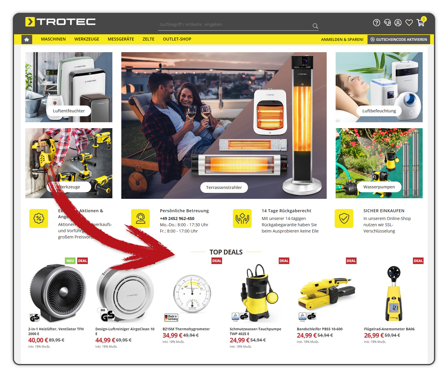 SO FINDEN SIE IHRE DEALS IM ONLINE-SHOP:Auf unserer Startseite im Online-Shop de.trotec.com/shop werden Ihnen alle „TOP DEALS“ angezeigt. Navigieren Sie einfach mit den Pfeilen nach „rechts“ und „links“ und Sie finden alle aktuellen Deals. |