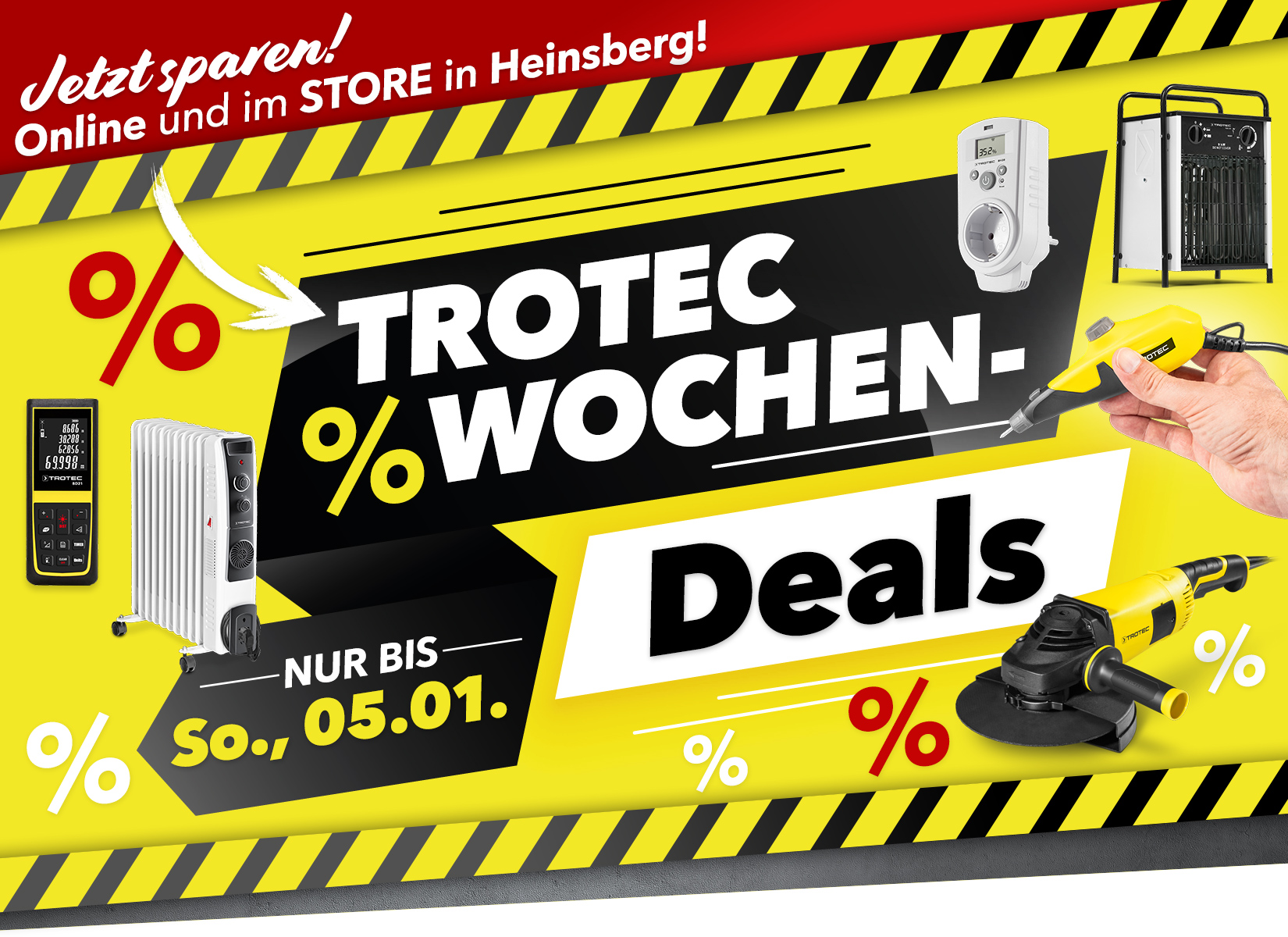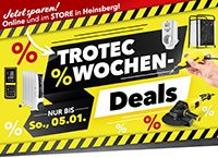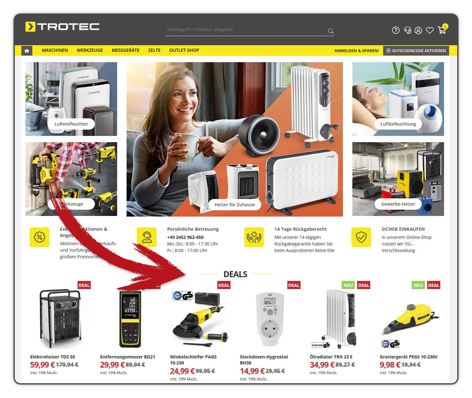 SO FINDEN SIE IHRE DEALS IM ONLINE-SHOP:Auf unserer Startseite im Online-Shop de.trotec.com/shop werden Ihnen alle „TOP DEALS“ angezeigt. Navigieren Sie einfach mit den Pfeilen nach „rechts“ und „links“ und Sie finden alle aktuellen Deals. |