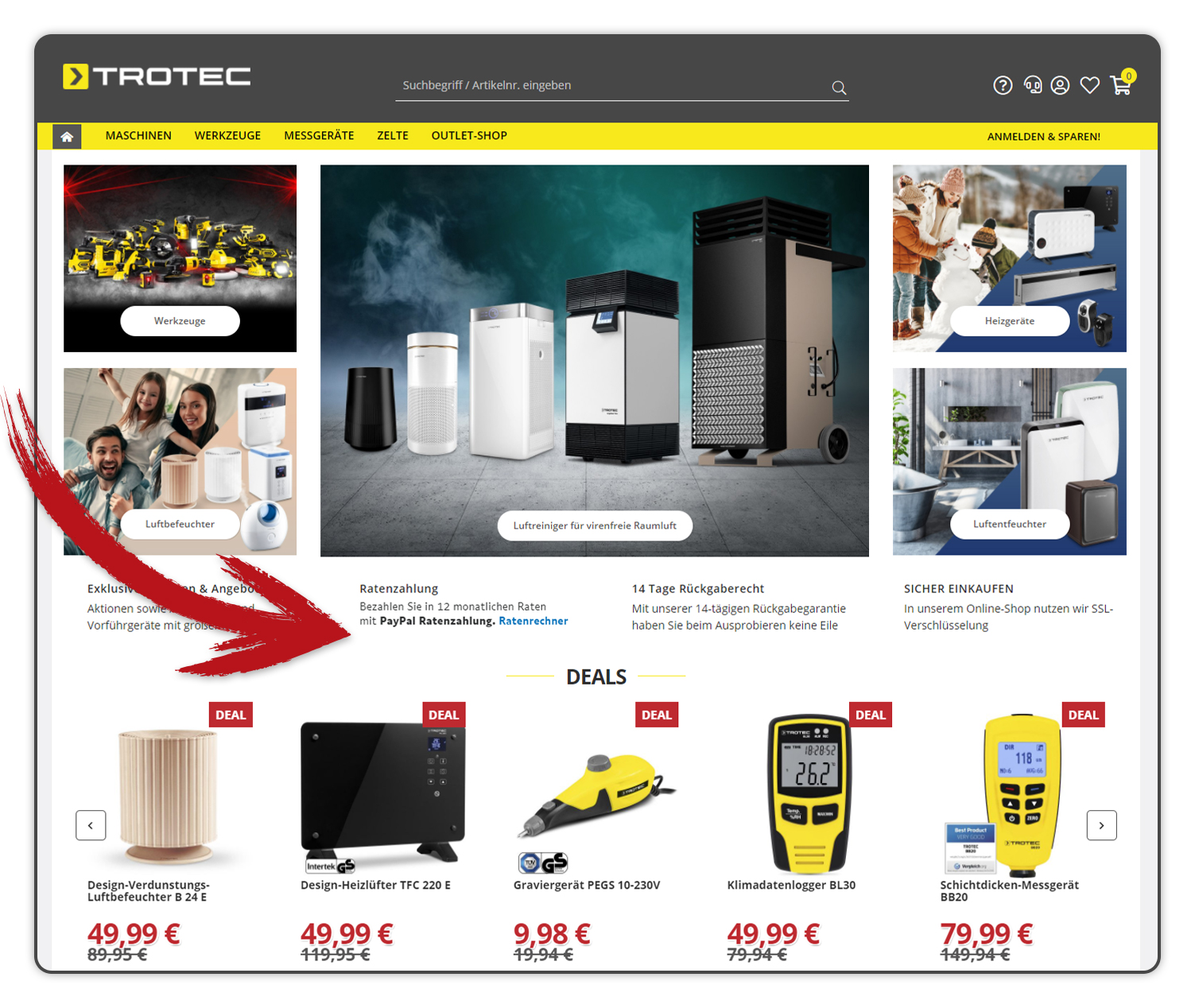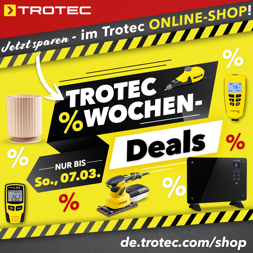 SO FINDEN SIE IHRE DEALS IM ONLINE-SHOP:Auf unserer Startseite im Online-Shop de.trotec.com/shop werden Ihnen alle „TOP DEALS“ angezeigt. Navigieren Sie einfach mit den Pfeilen nach „rechts“ und „links“ und Sie finden alle aktuellen Deals. |