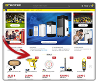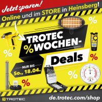 SO FINDEN SIE IHRE DEALS IM ONLINE-SHOP:Auf unserer Startseite im Online-Shop de.trotec.com/shop werden Ihnen alle „TOP DEALS“ angezeigt. Navigieren Sie einfach mit den Pfeilen nach „rechts“ und „links“ und Sie finden alle aktuellen Deals. |