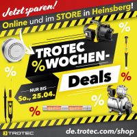 SO FINDEN SIE IHRE DEALS IM ONLINE-SHOP:Auf unserer Startseite im Online-Shop de.trotec.com/shop werden Ihnen alle „TOP DEALS“ angezeigt. Navigieren Sie einfach mit den Pfeilen nach „rechts“ und „links“ und Sie finden alle aktuellen Deals. |