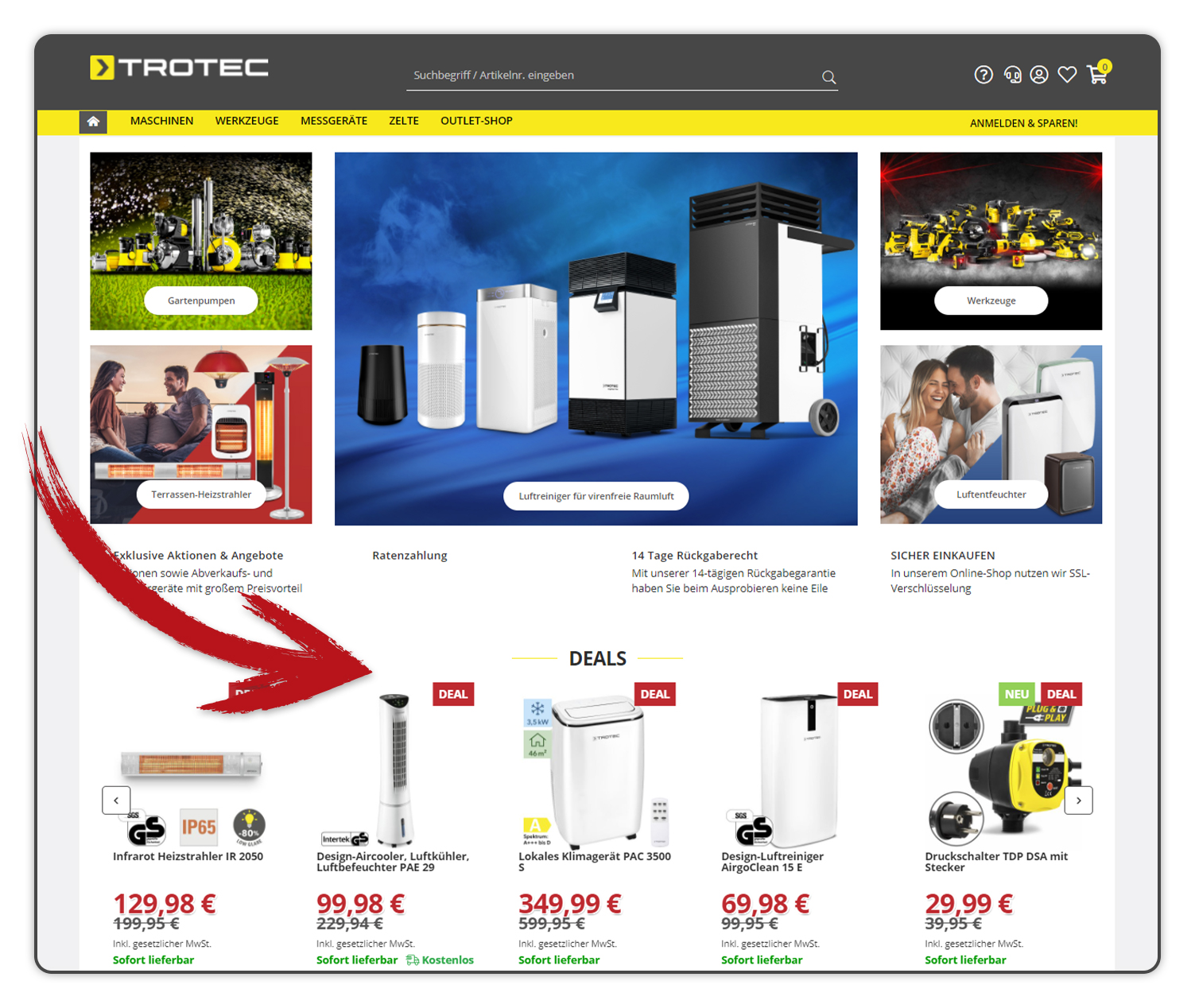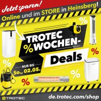 SO FINDEN SIE IHRE DEALS IM ONLINE-SHOP:Auf unserer Startseite im Online-Shop de.trotec.com/shop werden Ihnen alle „TOP DEALS“ angezeigt. Navigieren Sie einfach mit den Pfeilen nach „rechts“ und „links“ und Sie finden alle aktuellen Deals. |