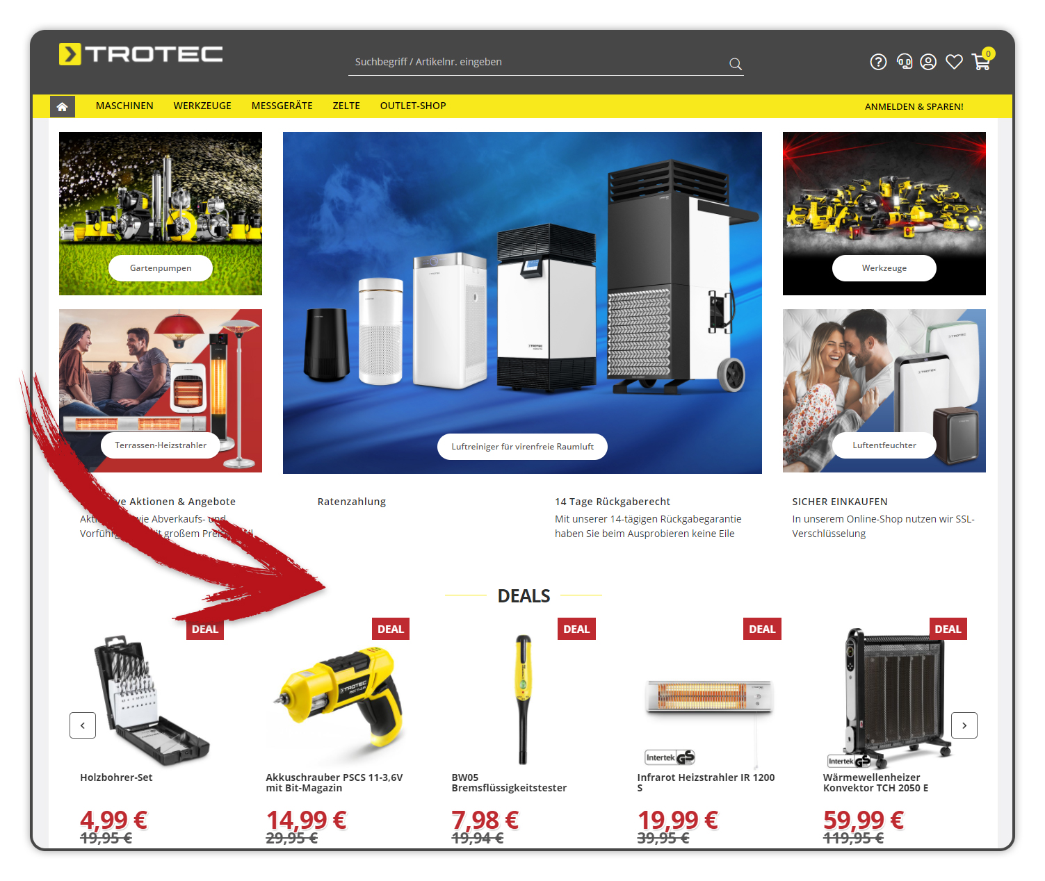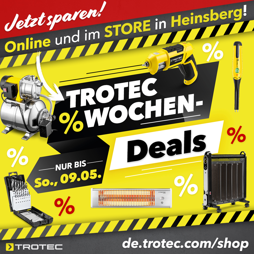 SO FINDEN SIE IHRE DEALS IM ONLINE-SHOP:Auf unserer Startseite im Online-Shop de.trotec.com/shop werden Ihnen alle „TOP DEALS“ angezeigt. Navigieren Sie einfach mit den Pfeilen nach „rechts“ und „links“ und Sie finden alle aktuellen Deals. |