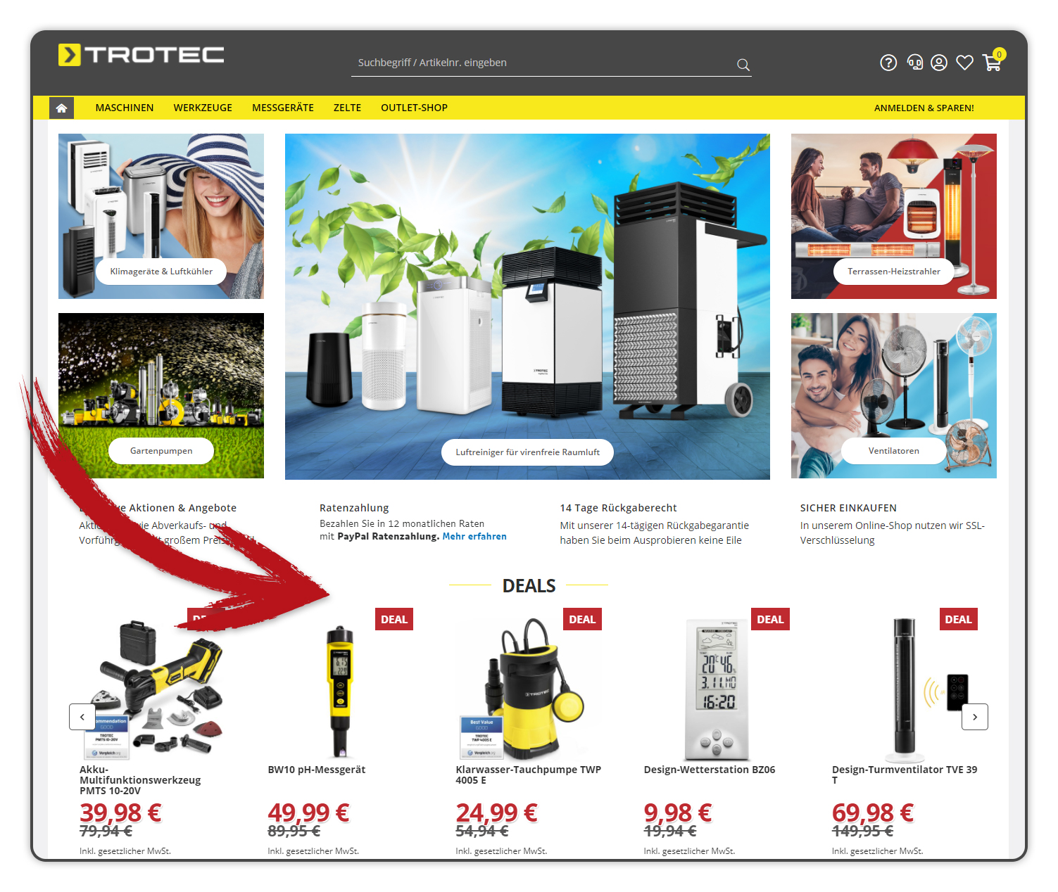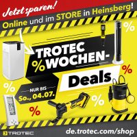 SO FINDEN SIE IHRE DEALS IM ONLINE-SHOP:Auf unserer Startseite im Online-Shop de.trotec.com/shop werden Ihnen alle „TOP DEALS“ angezeigt. Navigieren Sie einfach mit den Pfeilen nach „rechts“ und „links“ und Sie finden alle aktuellen Deals. |