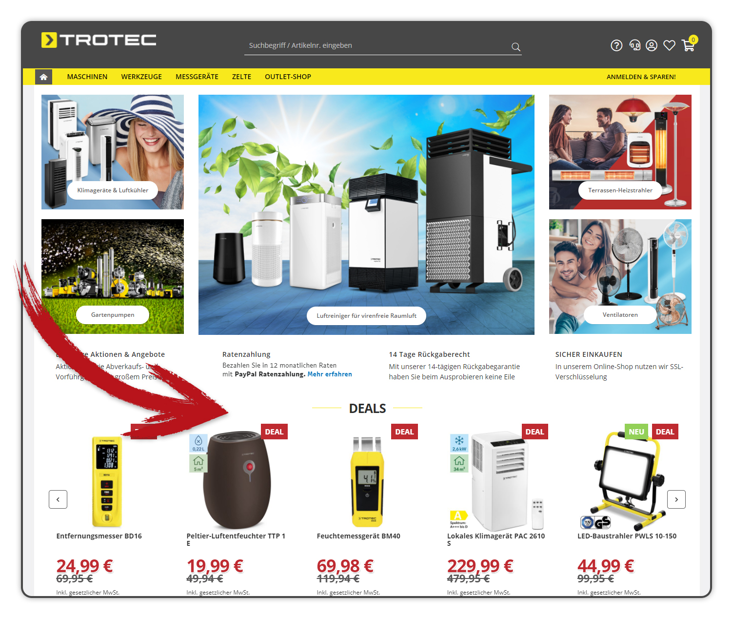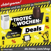 SO FINDEN SIE IHRE DEALS IM ONLINE-SHOP:Auf unserer Startseite im Online-Shop de.trotec.com/shop werden Ihnen alle „TOP DEALS“ angezeigt. Navigieren Sie einfach mit den Pfeilen nach „rechts“ und „links“ und Sie finden alle aktuellen Deals. |