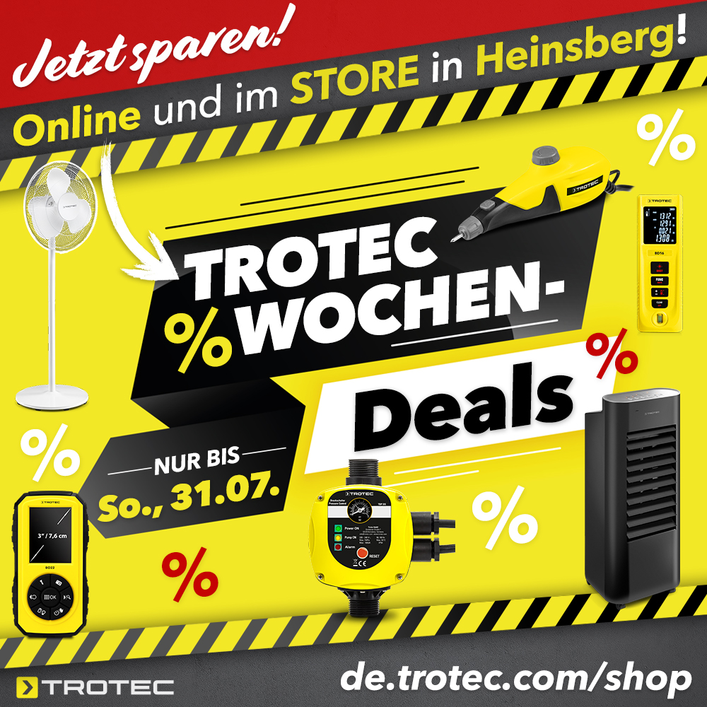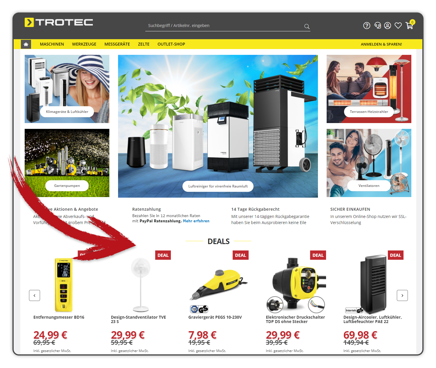 SO FINDEN SIE IHRE DEALS IM ONLINE-SHOP:Auf unserer Startseite im Online-Shop de.trotec.com/shop werden Ihnen alle „TOP DEALS“ angezeigt. Navigieren Sie einfach mit den Pfeilen nach „rechts“ und „links“ und Sie finden alle aktuellen Deals. |