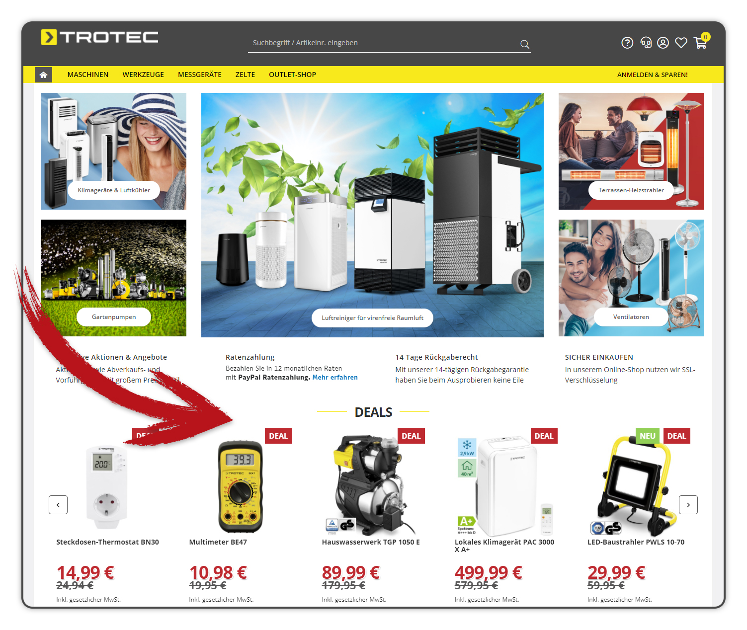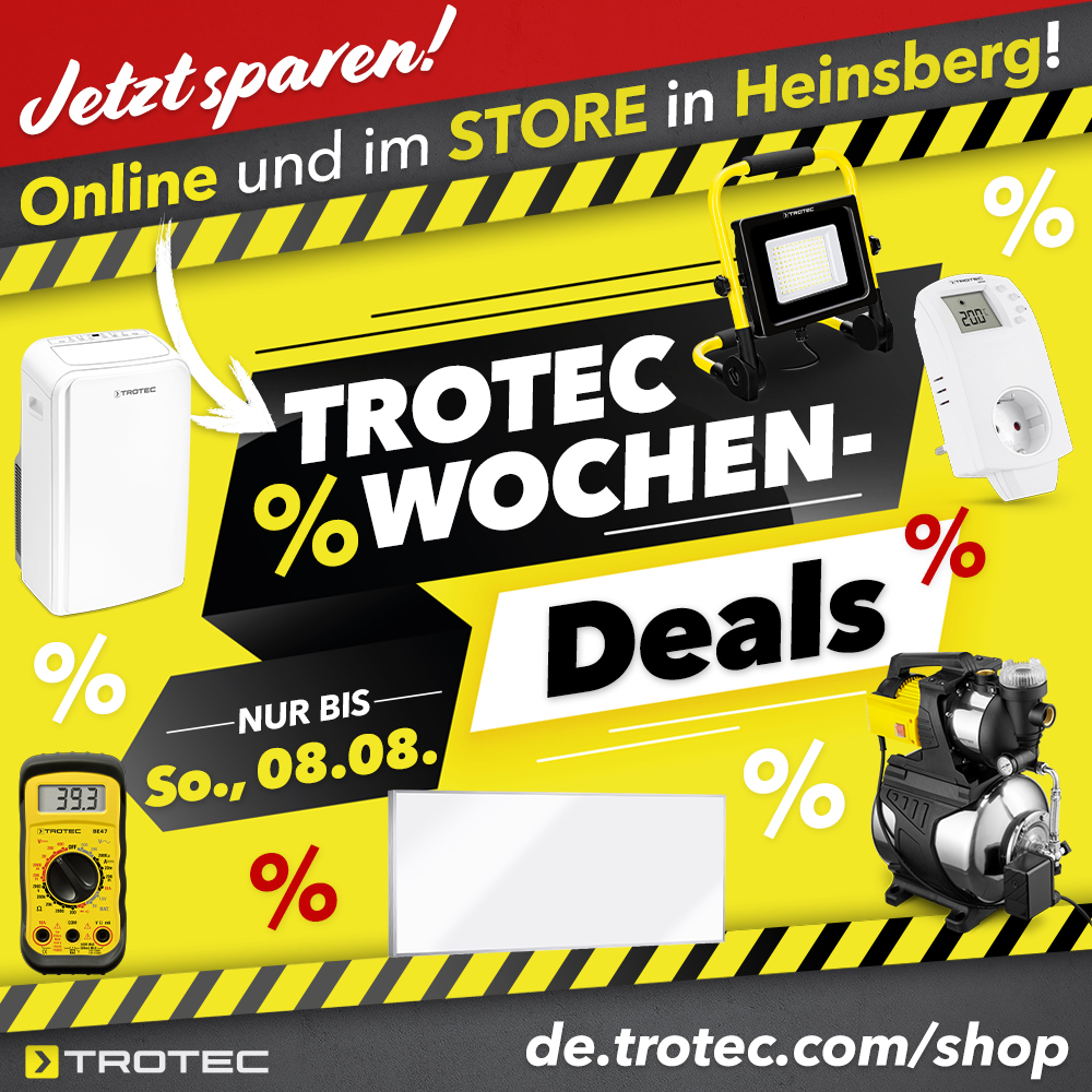 SO FINDEN SIE IHRE DEALS IM ONLINE-SHOP:Auf unserer Startseite im Online-Shop de.trotec.com/shop werden Ihnen alle „TOP DEALS“ angezeigt. Navigieren Sie einfach mit den Pfeilen nach „rechts“ und „links“ und Sie finden alle aktuellen Deals. |