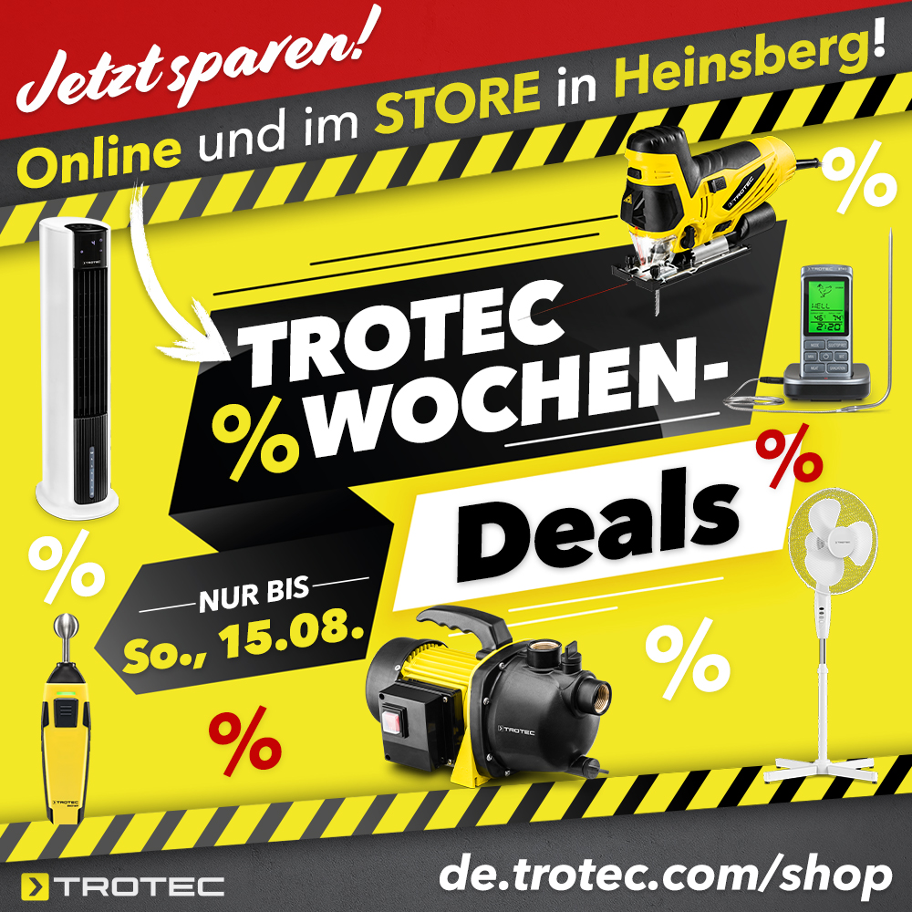 SO FINDEN SIE IHRE DEALS IM ONLINE-SHOP:Auf unserer Startseite im Online-Shop de.trotec.com/shop werden Ihnen alle „TOP DEALS“ angezeigt. Navigieren Sie einfach mit den Pfeilen nach „rechts“ und „links“ und Sie finden alle aktuellen Deals. |
