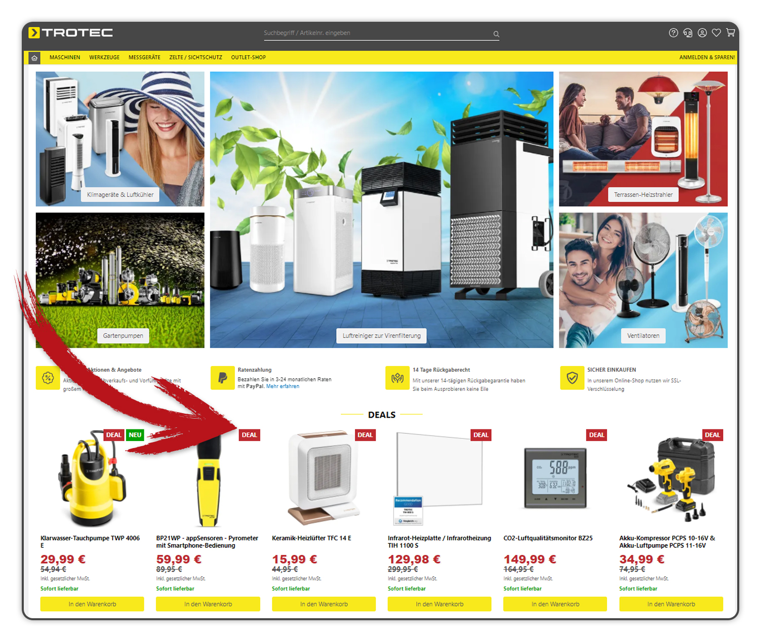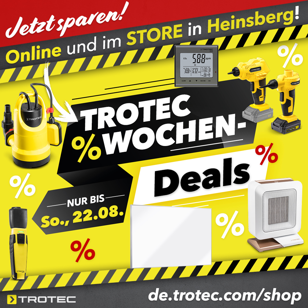 SO FINDEN SIE IHRE DEALS IM ONLINE-SHOP:Auf unserer Startseite im Online-Shop de.trotec.com/shop werden Ihnen alle „TOP DEALS“ angezeigt. Navigieren Sie einfach mit den Pfeilen nach „rechts“ und „links“ und Sie finden alle aktuellen Deals. |