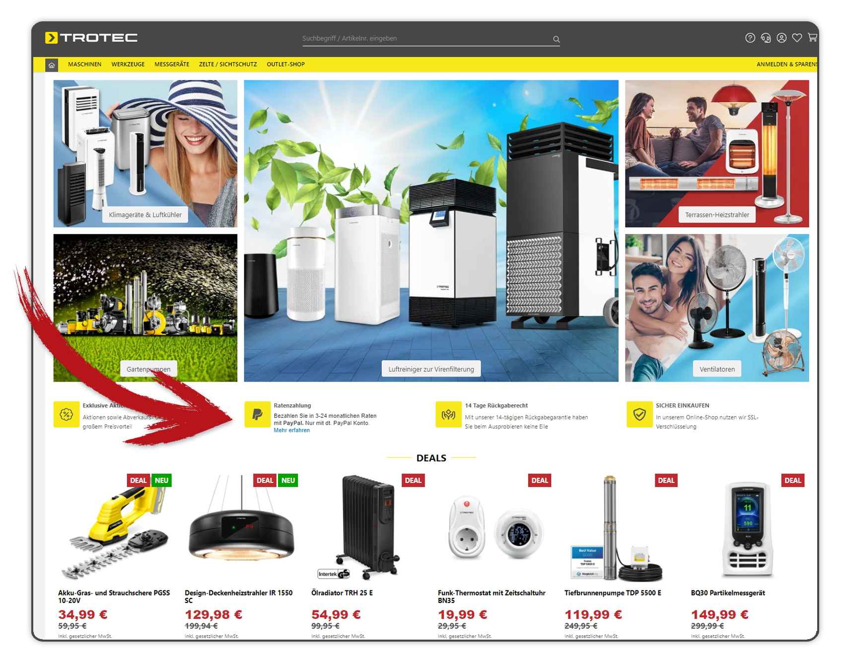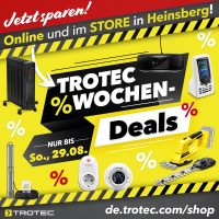 Auf unserer Startseite im Online-Shop de.trotec.com/shop werden Ihnen alle „TOP DEALS“ angezeigt. Navigieren Sie einfach mit den Pfeilen nach „rechts“ und „links“ und Sie finden alle aktuellen Deals.