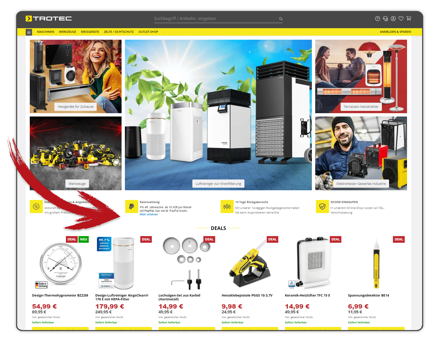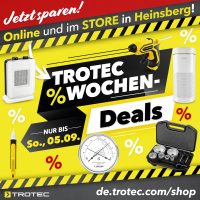 Auf unserer Startseite im Online-Shop de.trotec.com/shop werden Ihnen alle „TOP DEALS“ angezeigt. Navigieren Sie einfach mit den Pfeilen nach „rechts“ und „links“ und Sie finden alle aktuellen Deals.