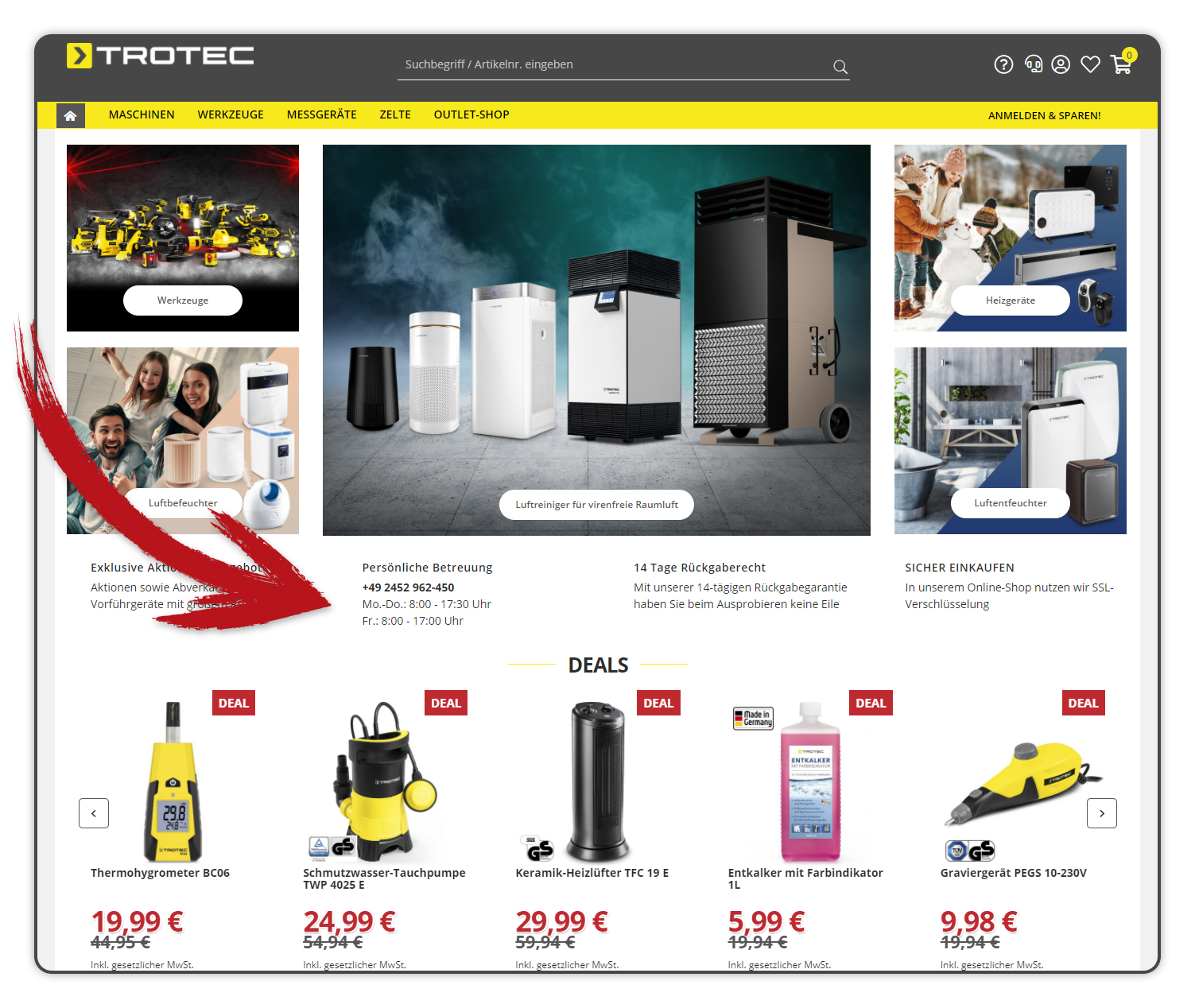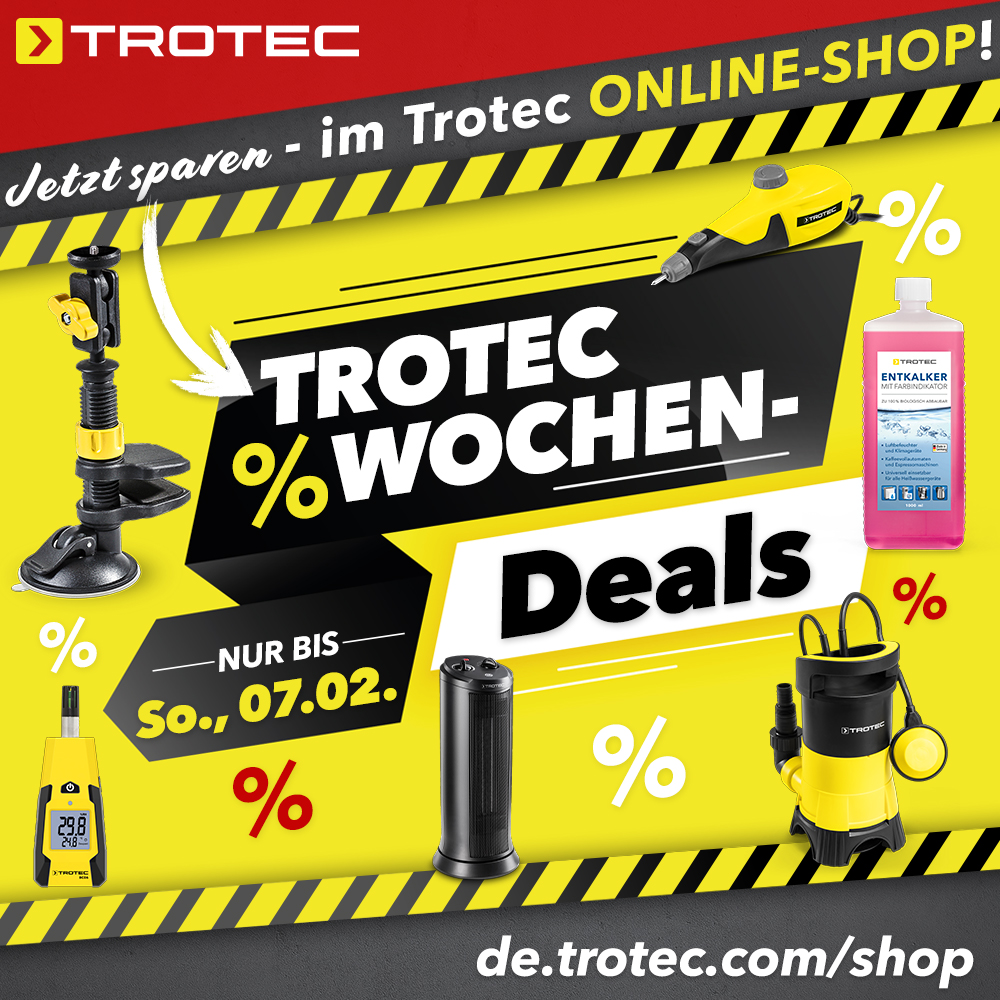 Auf unserer Startseite im Online-Shop de.trotec.com/shop werden Ihnen alle „TOP DEALS“ angezeigt. Navigieren Sie einfach mit den Pfeilen nach „rechts“ und „links“ und Sie finden alle aktuellen Deals.