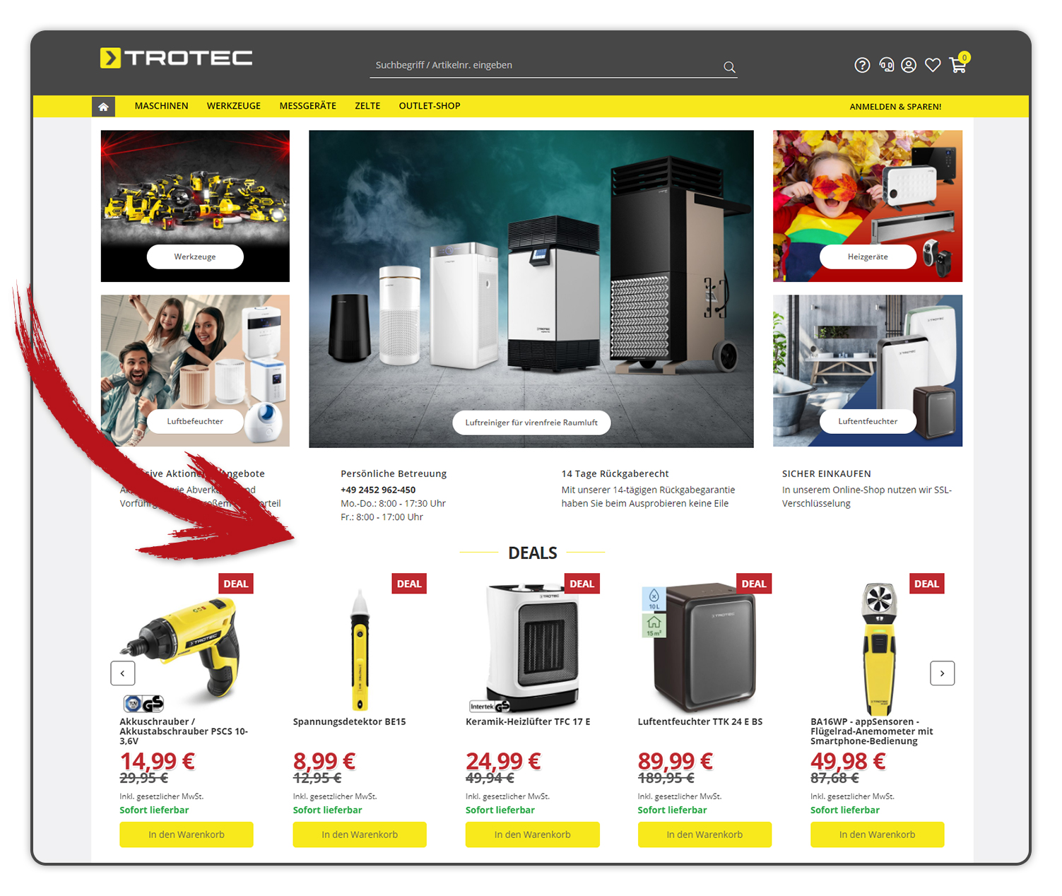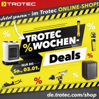 SO FINDEN SIE IHRE DEALS IM ONLINE-SHOP:Auf unserer Startseite im Online-Shop de.trotec.com/shop werden Ihnen alle „TOP DEALS“ angezeigt. Navigieren Sie einfach mit den Pfeilen nach „rechts“ und „links“ und Sie finden alle aktuellen Deals. |