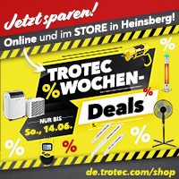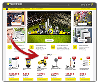 SO FINDEN SIE IHRE DEALS IM ONLINE-SHOP:Auf unserer Startseite im Online-Shop de.trotec.com/shop werden Ihnen alle „TOP DEALS“ angezeigt. Navigieren Sie einfach mit den Pfeilen nach „rechts“ und „links“ und Sie finden alle aktuellen Deals. |