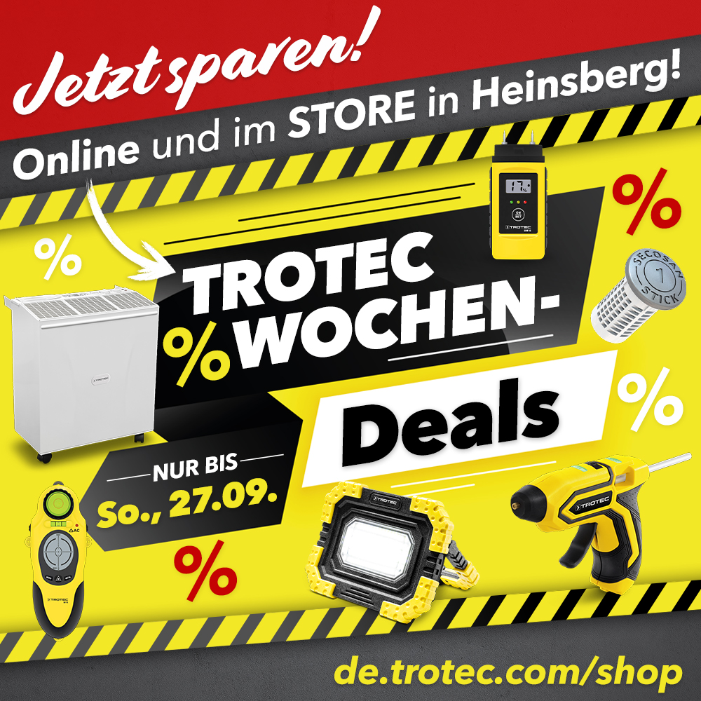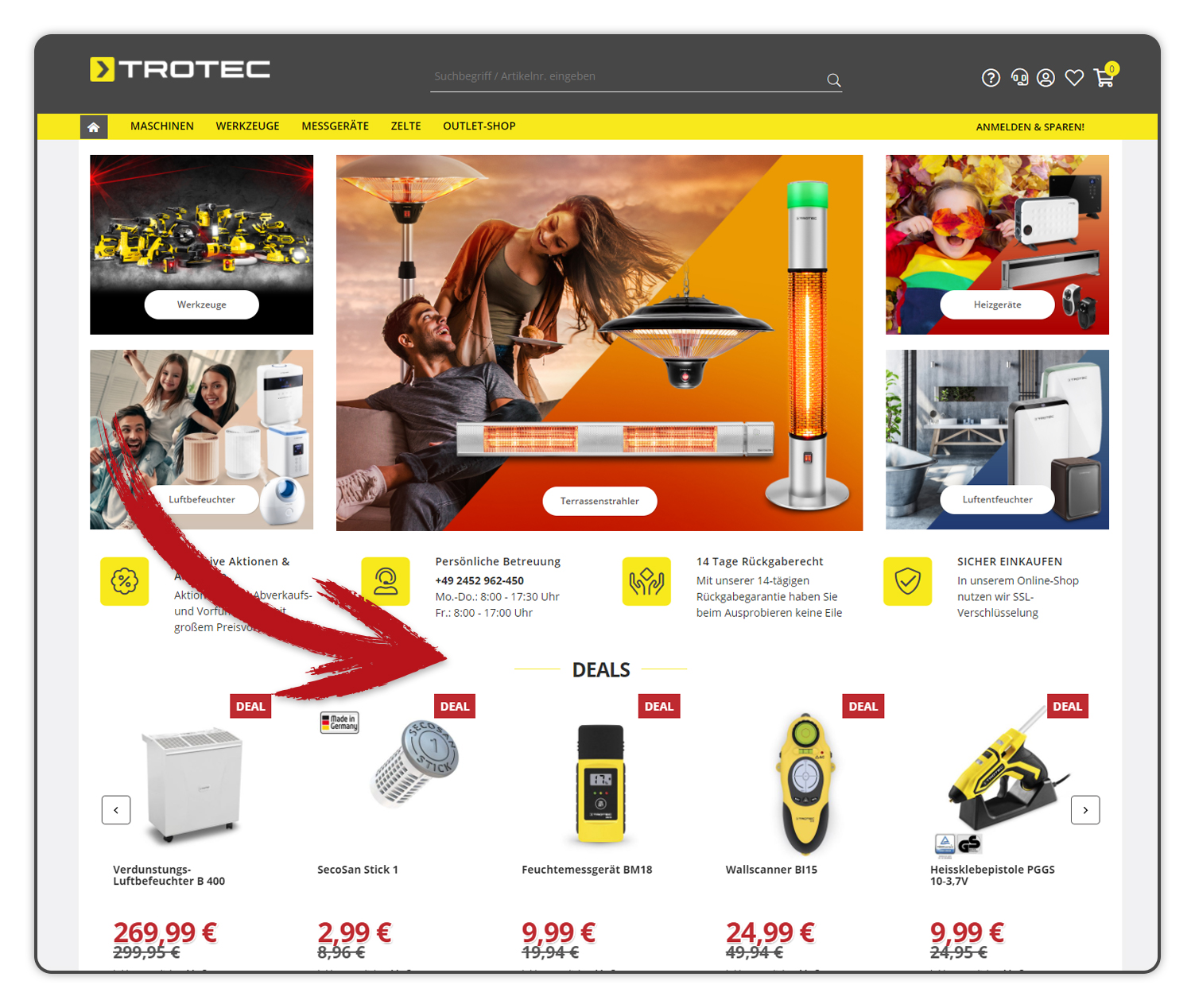 SO FINDEN SIE IHRE DEALS IM ONLINE-SHOP:Auf unserer Startseite im Online-Shop de.trotec.com/shop werden Ihnen alle „TOP DEALS“ angezeigt. Navigieren Sie einfach mit den Pfeilen nach „rechts“ und „links“ und Sie finden alle aktuellen Deals. |