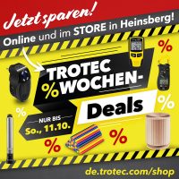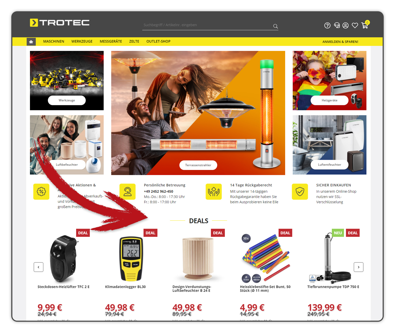 SO FINDEN SIE IHRE DEALS IM ONLINE-SHOP:Auf unserer Startseite im Online-Shop de.trotec.com/shop werden Ihnen alle „TOP DEALS“ angezeigt. Navigieren Sie einfach mit den Pfeilen nach „rechts“ und „links“ und Sie finden alle aktuellen Deals. |