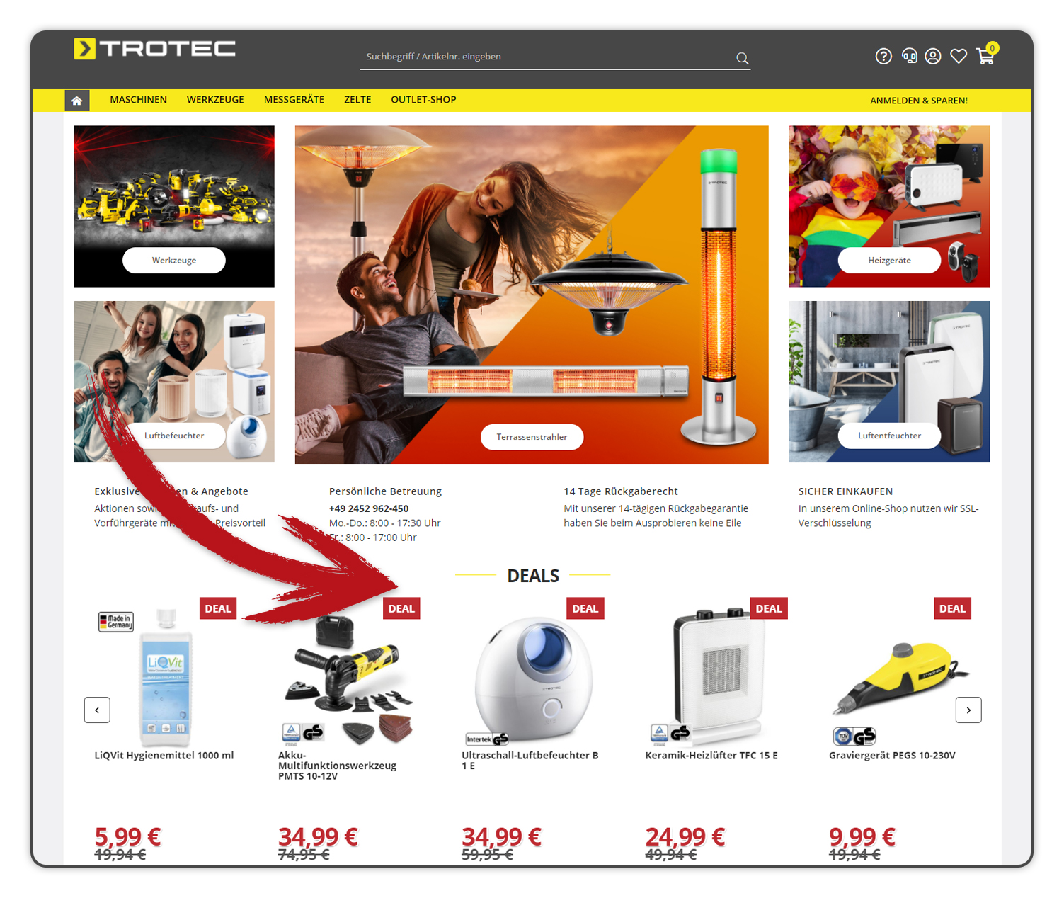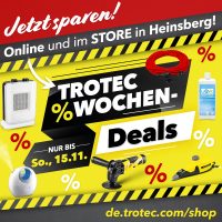 SO FINDEN SIE IHRE DEALS IM ONLINE-SHOP:Auf unserer Startseite im Online-Shop de.trotec.com/shop werden Ihnen alle „TOP DEALS“ angezeigt. Navigieren Sie einfach mit den Pfeilen nach „rechts“ und „links“ und Sie finden alle aktuellen Deals. |