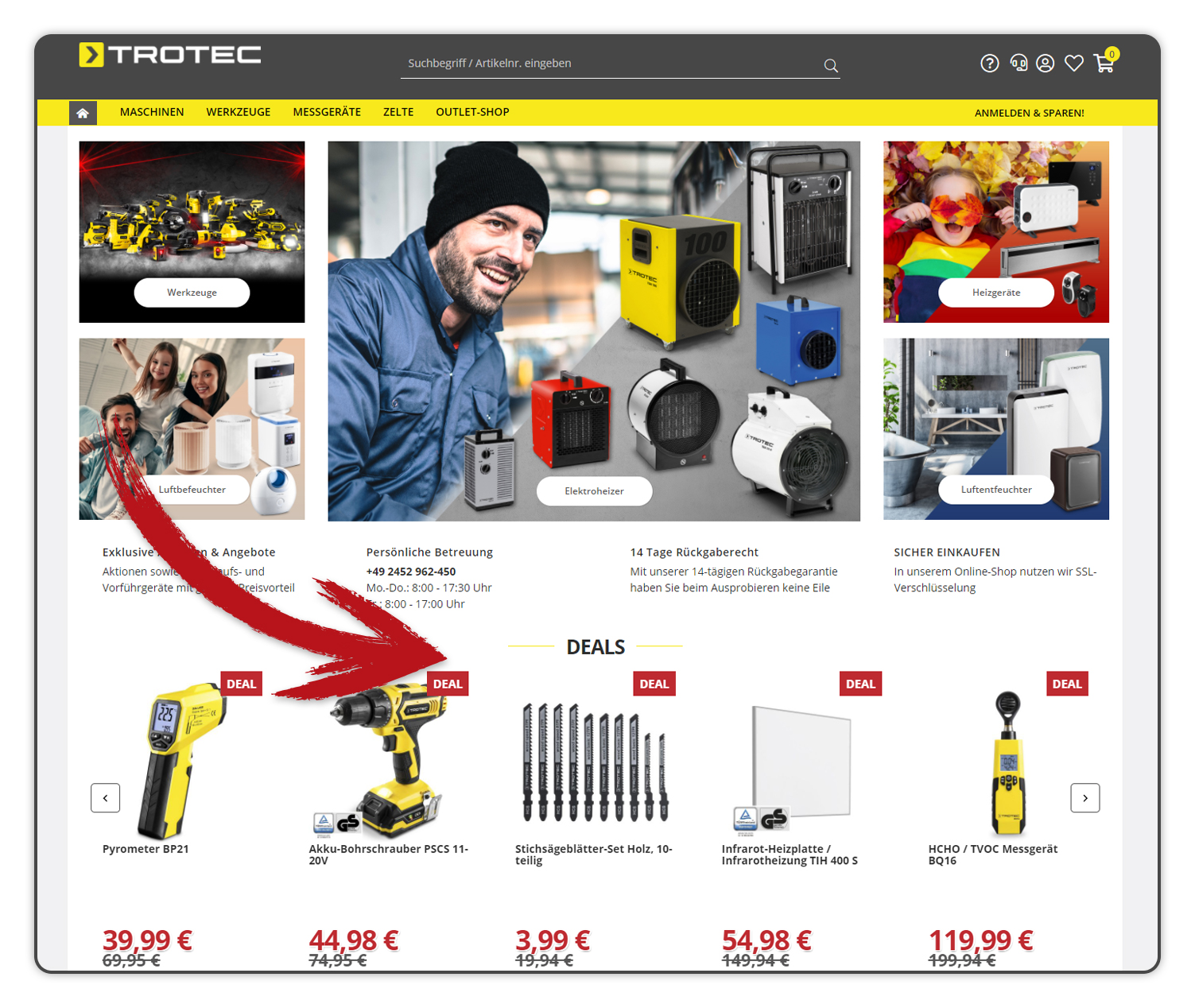 SO FINDEN SIE IHRE DEALS IM ONLINE-SHOP:Auf unserer Startseite im Online-Shop de.trotec.com/shop werden Ihnen alle „TOP DEALS“ angezeigt. Navigieren Sie einfach mit den Pfeilen nach „rechts“ und „links“ und Sie finden alle aktuellen Deals. |