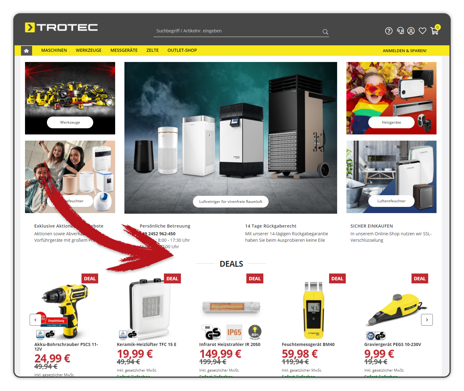 SO FINDEN SIE IHRE DEALS IM ONLINE-SHOP:Auf unserer Startseite im Online-Shop de.trotec.com/shop werden Ihnen alle „TOP DEALS“ angezeigt. Navigieren Sie einfach mit den Pfeilen nach „rechts“ und „links“ und Sie finden alle aktuellen Deals. |