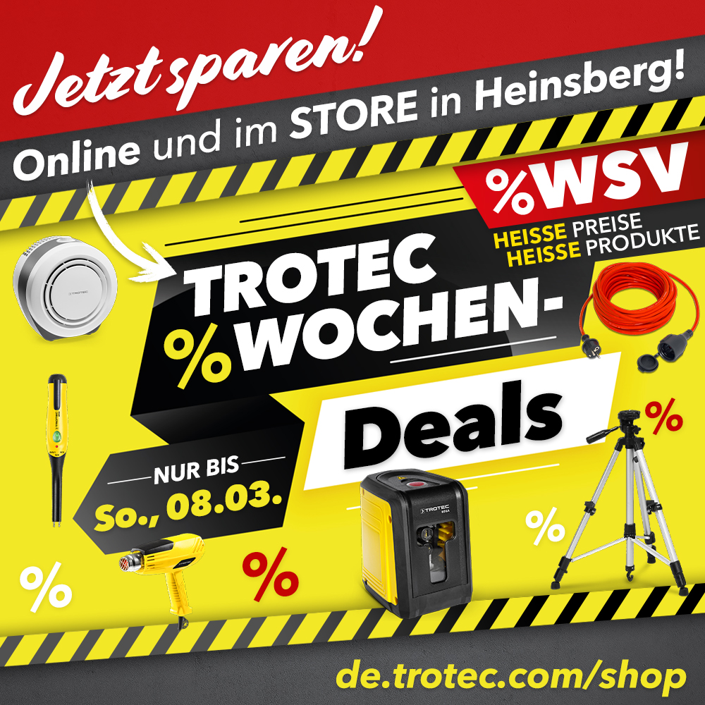 Auf unserer Startseite im Online-Shop de.trotec.com/shop werden Ihnen alle „TOP DEALS“ angezeigt. Navigieren Sie einfach mit den Pfeilen nach „rechts“ und „links“ und Sie finden alle aktuellen Deals.