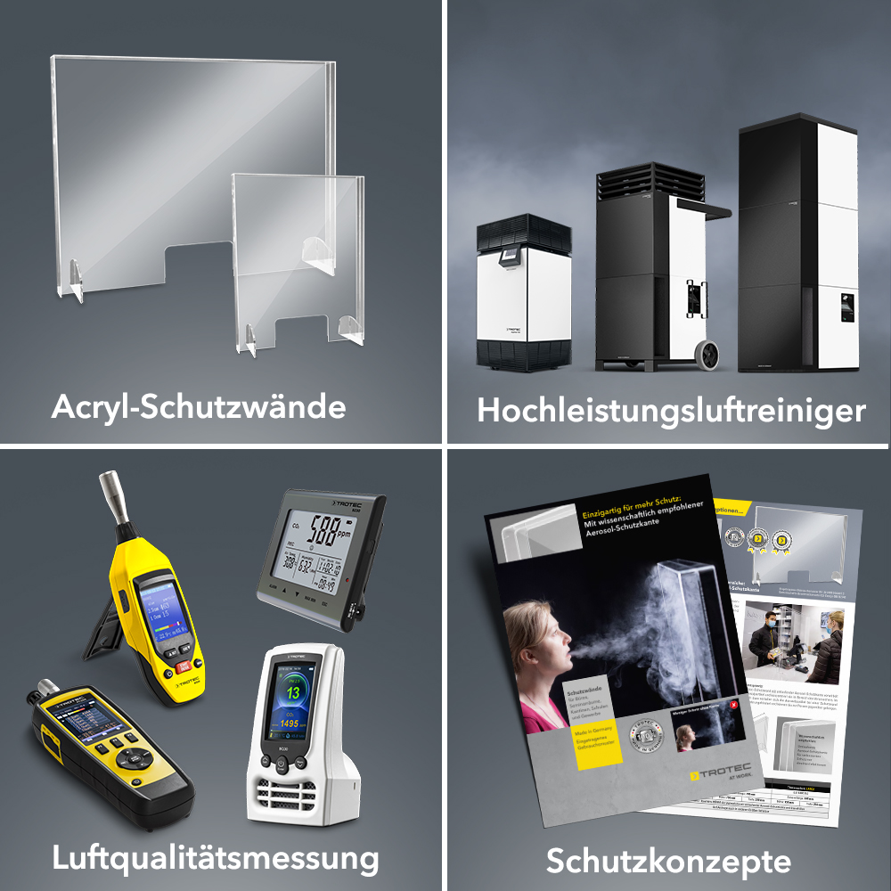 Beim Atmen, Sprechen oder Husten stoßen Menschen nicht nur große, sichtbare Speicheltröpfchen in einer Art „Sprühregen“ in den Raum aus, sondern in viel größerem Ausmaß auch winzig kleine Aerosole. Während die großen Tröpfchen aufgrund ihres Gewichtes bereits nach rund 1,5 Metern zu Boden sinken (hieraus resultiert die Abstandsregel von 1,5 Metern), halten sich infektiöse und nur einen tausendstel Millimeter große Aerosole für mehrere Stunden in der Luft und werden eingeatmet. Ziel muss es daher sein, die Atemluftdurchmengung am Arbeitsplatz so weit wie möglich zu verhindern. Das gelingt mit mobilen Luftreinigern von Trotec. Neben infektiösen Krankheitserregern wie Viren und Bakterien filtern Trotec-Luftreiniger auch Pollen, Allergene und Feinstaubpartikel aus der Luft.