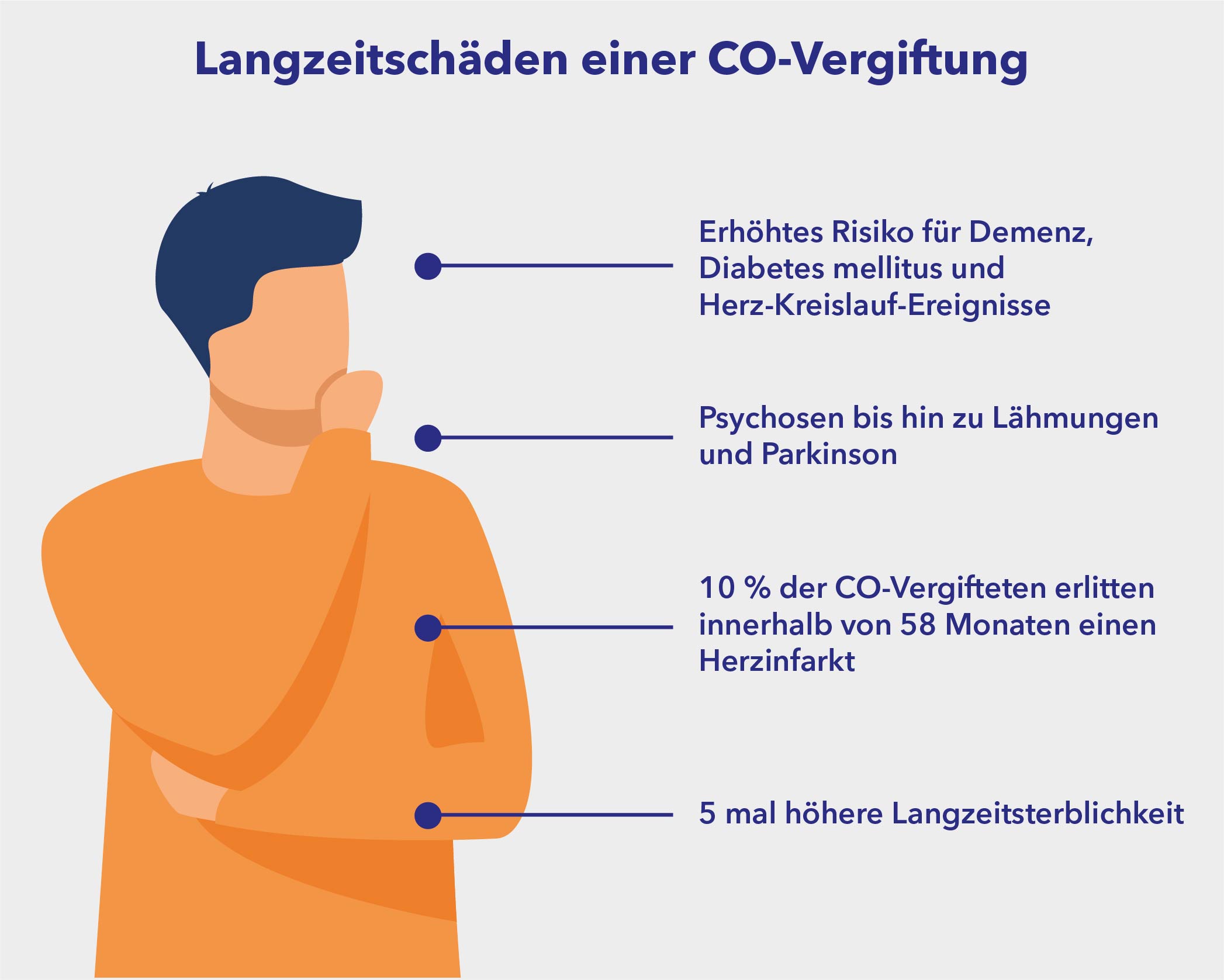 Kohlenmonoxid (CO) ist ein farb-, geruch- und geschmackloses Gas, das in hoher Konzentration als Atemgift wirkt. Kopfschmerzen, Schwindel, Verwirrtheit, Übelkeit, Erbrechen und Müdigkeit können Symptome einer Co-Vergiftung sein. Schwerere Vergiftungen können bis zur Bewusstlosigkeit und auch zum Tod führen. Da die Symptome einer CO-Vergiftung recht unspezifisch sind, schätzen Betroffene sie meist nicht sofort als Folge einer CO-Vergiftung ein.