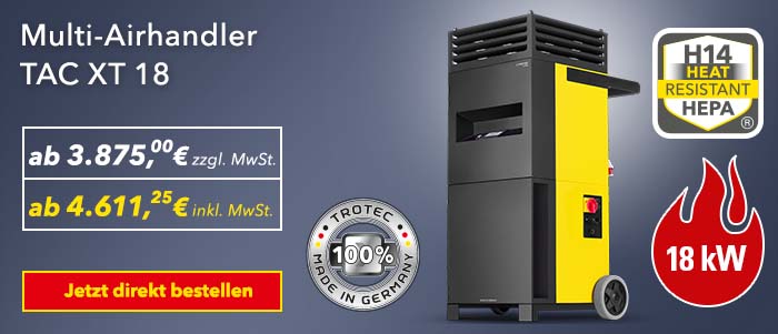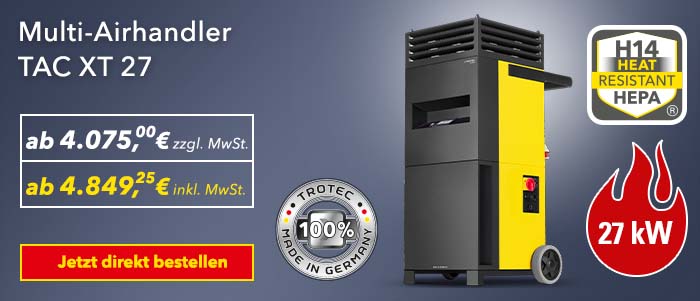 Durch diese bei mobilen Hochleistungsluftreinigern einzigartige Multifunktionalität prädestinieren sich die Hochleistungsluftreiniger TAC XT 18 (18 kW Heizleistung) und TAC XT 27 (27 kW Heizleistung) insbesondere für den interdisziplinären Einsatz in der aktuellen Flüchtlingssituation. Erhältlich ist der Multi-Airhandler TAC XT im Trotec Online-Shop sowie im stationären Trotec-Store in Heinsberg.