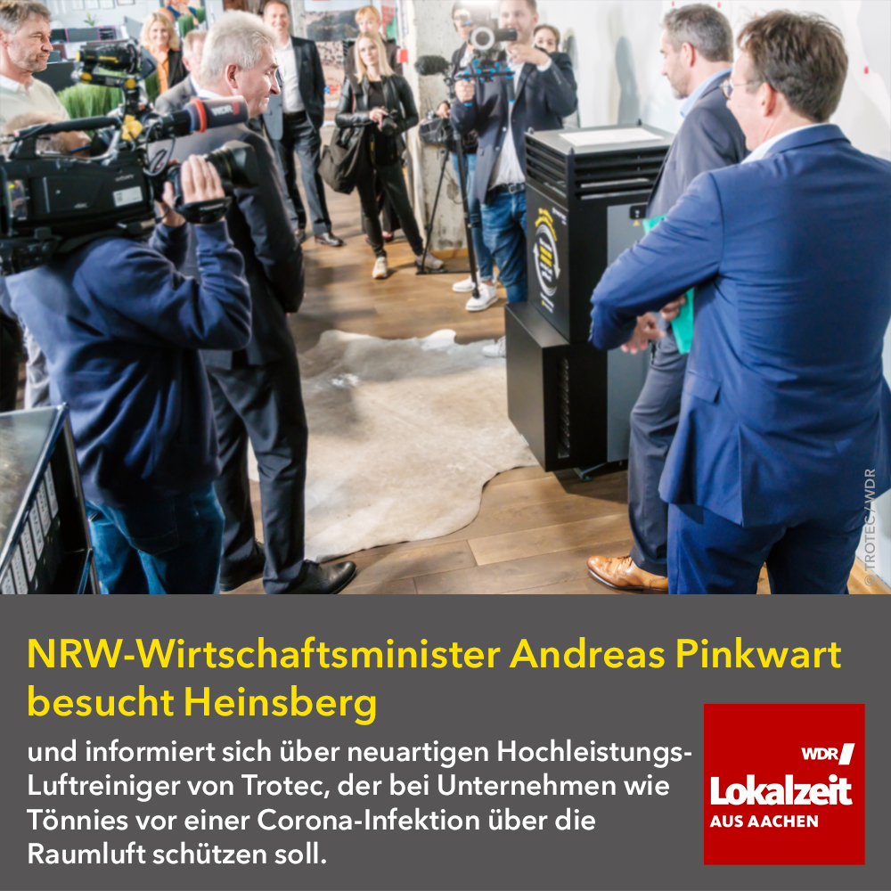 NRW-Wirtschaftsminister Andreas Pinkwart hat am Freitag verschiedene Unternehmen im Kreis Heinsberg besucht. Gemeinsam mit Landrat Stephan Pusch besuchte er unter anderem den Fleischexperten Otto Gourmet, um sich hier eine in Heinsberg entwickelte Hochleistungs-Luftreinigungstechnik vorführen zu lassen, die bereits beim Fleischbetrieb Tönnies im Einsatz ist, um die dortigen Mitarbeiter vor Coronaviren in der Atemluft zu schützen. Der von Trotec hergestellte Hochleistungs-Luftreiniger TAC V+ saugt die Raumluft an, filtert diese und vernichtet luftgetragene Coronaviren in einem neuartigen HEPA-Filter mit thermischer HEPA-Filterdekontamination. Diese Filtertechnik ist weltweit einzigartig und laut Stephan Pusch ein Beweis für die Leistungsfähigkeit des Landkreises Heinsberg.