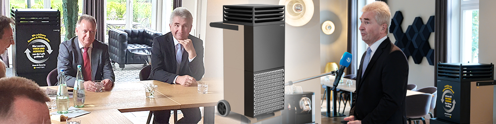 Besonders angetan war Wirtschaftsminister Pinkwart von der neuesten Trotec-Entwicklung, einem Hochleistungs-Luftreiniger mit weltweit einzigartiger thermischer HEPA-Filterdekontamination, um das Coronavirus aus der Raumluft zu beseitigen und abzutöten. Dazu werden infektiöse Aerosole, die laut Experten hauptursächlich für die Verbreitung des Virus sind, aus der Innenraumluft herausgefiltert und mit einer neuartigen Technik im Filter inaktiviert. Aerosole sind ein Gemisch aus Gas (in aller Regel Luft) und festen oder flüssigen Bestandteilen, die bei erkrankten Personen Viren enthalten. Diese winzig kleinen Schwebeteilchen werden beim Atmen und Sprechen in die Raumluft freigesetzt. Während größere Tröpfchen aufgrund ihres Gewichts bereits nach ca. 1,5 Metern zu Boden sinken (daher die Abstandsregel von 1,5 m), schweben Aerosolteilchen aufgrund ihrer geringen Größe bis zu mehrere Stunden in der Raumluft – und werden eingeatmet.