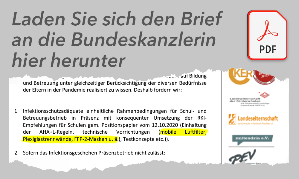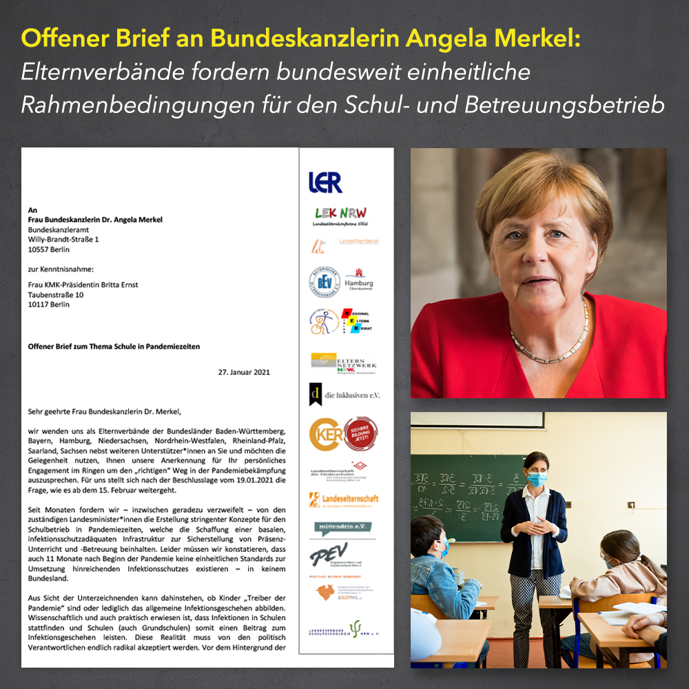 Vor diesem Hintergrund haben die Elternverbände der Bundesländer Baden-Württemberg, Bayern, Hamburg, Niedersachsen, Nordrhein-Westfalen, Rheinland-Pfalz, Saarland, Sachsen sowie weitere Unterstützer*innen nun einen offenen Brief an die Bundeskanzlerin Angela Merkel gerichtet. Gefordert werden „infektionsschutzadäquate einheitliche Rahmenbedingungen für Schul- und Betreuungsbetrieb in Präsenz“ mit konsequenter Umsetzung geeigneter technischer Maßnahmen.