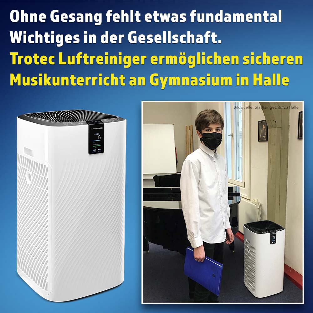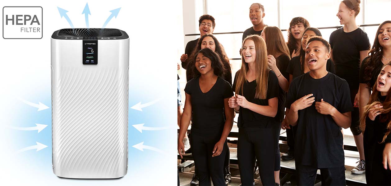 Um den Musikunterricht und das gemeinschaftliche Singen in der Pandemie fortführen zu können, sorgen mobile Trotec-Luftreiniger der AirgoClean-Serie in den Unterrichtszimmern, dass möglichst frisch und froh gesunden werden kann – ohne sich dabei um Coronaviren in der Luft sorgen zu müssen. AirgoClean 250 E Hochleistungsftreiniger reinigen fortlaufend die Raumluft in den Unterrichtsräumen, wobei potentiell infektiöse Virenpartikel zu mehr als 99 Prozent aus der Raumluft gefiltert werden.