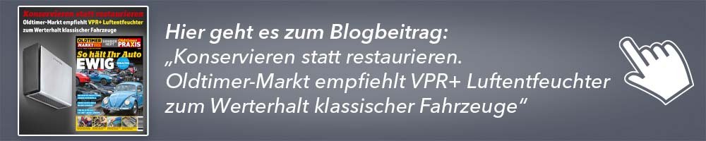 Was gilt es bei der gemeinsamen Lagerung neuer und älterer Fahrzeuge in der Garage zu beachten? Wie verändert sich die Luftfeuchtigkeit in der Garage durch offene Garagentore und wie lassen sich Fahrzeuge während der Winterpause optimal vor Rost und Schimmel schützen? Das und mehr erfahren Sie in unserem VPR + Ratgeber für Besitzer klassischer Fahrzeuge – der als kostenloser PDF-Download für Sie bereitsteht.