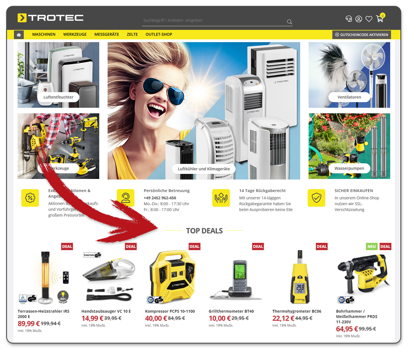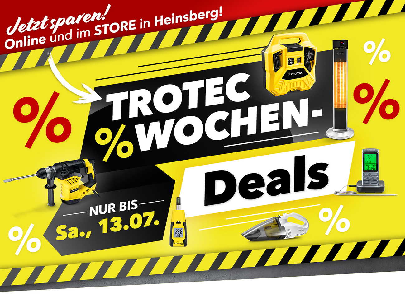 SO FINDEN SIE IHRE DEALS IM ONLINE-SHOP:Auf unserer Startseite im Online-Shop de.trotec.com/shop werden Ihnen alle „TOP DEALS“ angezeigt. Navigieren Sie einfach mit den Pfeilen nach „rechts“ und „links“ und Sie finden alle aktuellen Deals. |