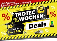 Auf unserer Startseite im Online-Shop de.trotec.com/shop werden Ihnen alle „TOP DEALS“ angezeigt. Navigieren Sie einfach mit den Pfeilen nach „rechts“ und „links“ und Sie finden alle aktuellen Deals.
