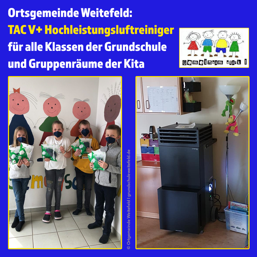 Seit einigen Wochen komplettieren mobile TAC V+ Hochleistungsluftreiniger die Hygienekonzepte der Weitefelder Kindertagesstätte Sonnenwiese und der örtlichen Grundschule. In allen Klassen der Grundschule, im Raum der Nachmittagsbetreuung, sowie in jedem Gruppenraum der Kita sorgen die Geräte nunmehr für einen bestmöglichen Schutz der Kinder, des Lehrpersonals und der ErzieherInnen vor einer indirekten Ansteckung mit dem Coronavirus SARS-CoV-2.
