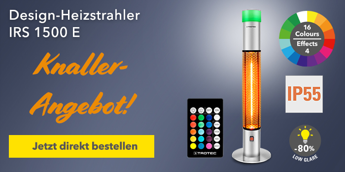 Tipp: Der Infrarot-Standheizer IRS 1500 E liefert neben schneller Wärme auch noch die passende Ambiente-Beleuchtung für die Outdoor-Party. Über die praktische Fernbedienung lassen sich 16 Farben und abwechslungsreiche Lichteffekte auswählen.